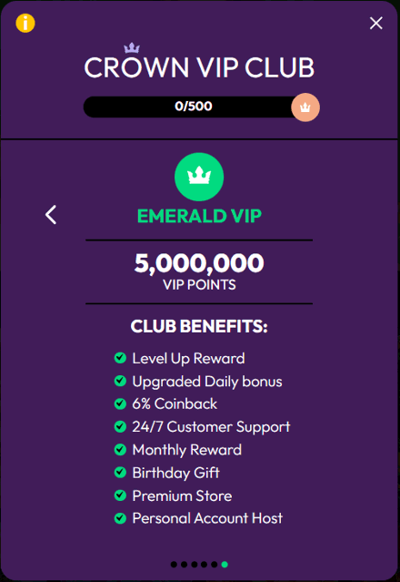 Crown VIP Club grants reloads, exclusive tournaments, rapid redemption times, and milestone rewards. Level up by earning VIP points through play and purchases; higher tiers add White Glove support and coin-back on losses.