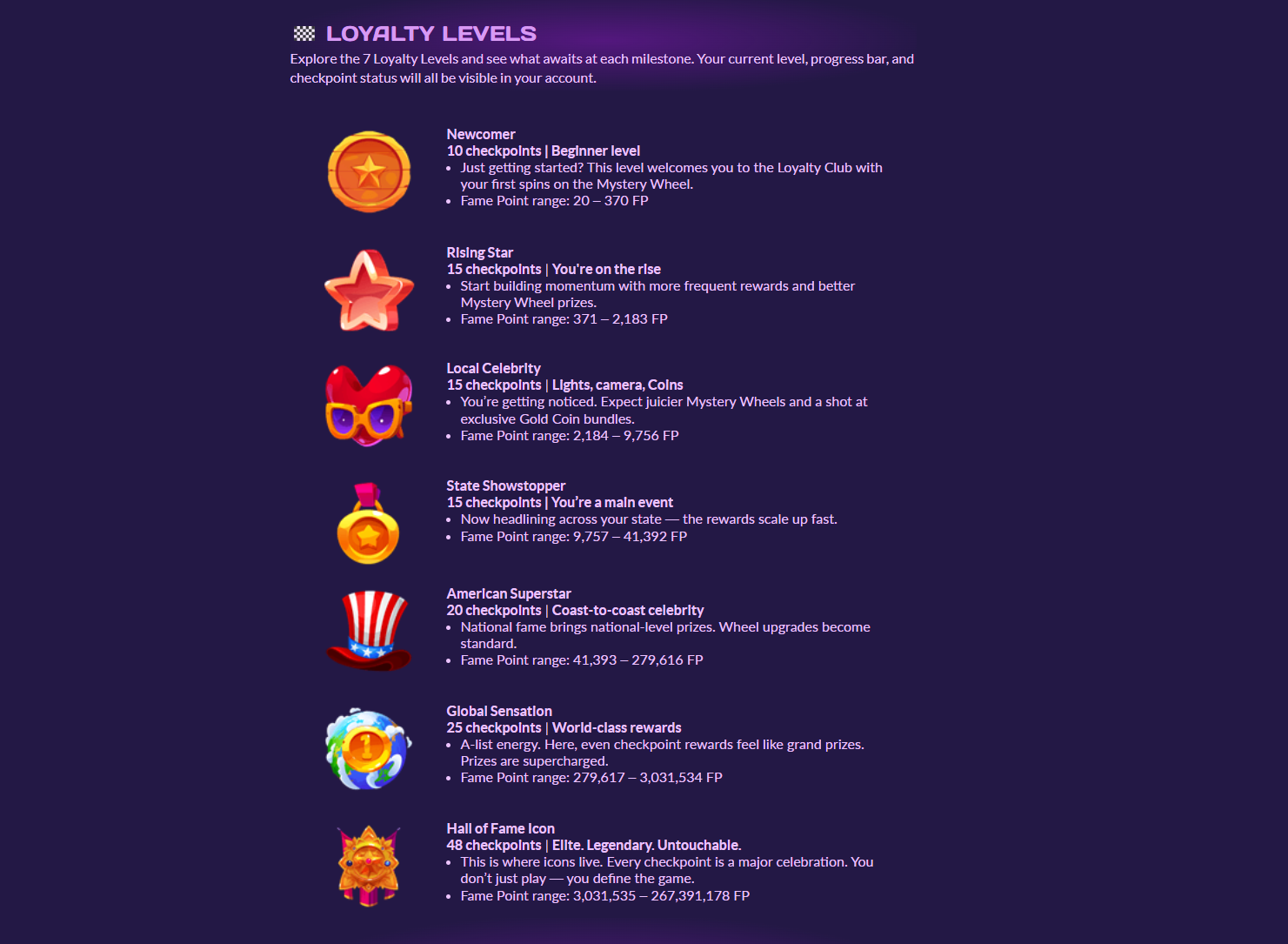 Since Aug 2025, PlayFame tracks every spin & login toward Fame Points. Each tier adds milestone rewards, Mystery Wheel spins, and invite-only booster drops. This is also one of my favorite sites and definetely favorite VIP structures. It is incredibly immersive and there are so many benefits to claim.