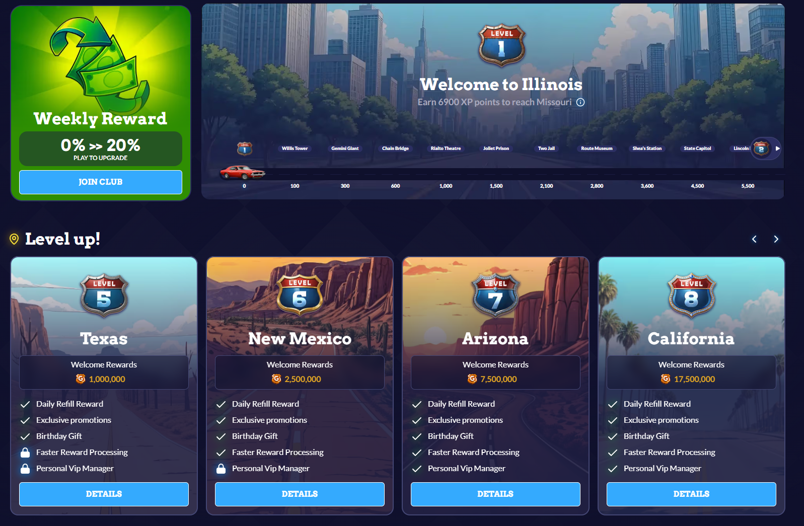 Unique, geography-inspired progression: each tier represents a state along historic Route 66. Play with Gold Coins or Sweep Coins to earn XP and travel from Illinois to California. Really fun and creative layout and structure. Absolutely one of my favorite VIP structures, and it definetely deserves the top spot!