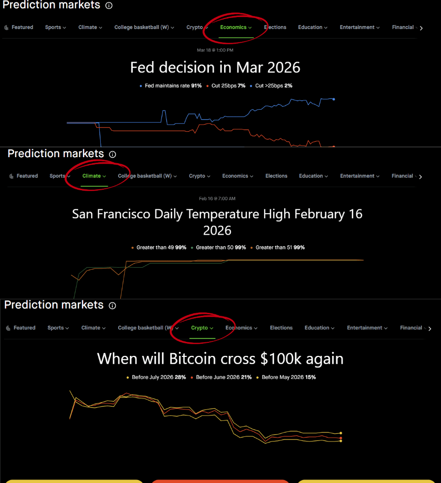 Climate Markets predict snow and rain totals in major cities, daily temperature highs, and seasonal precipitation ("Snow in New York City in Feb 2026 above 0.1 inches").