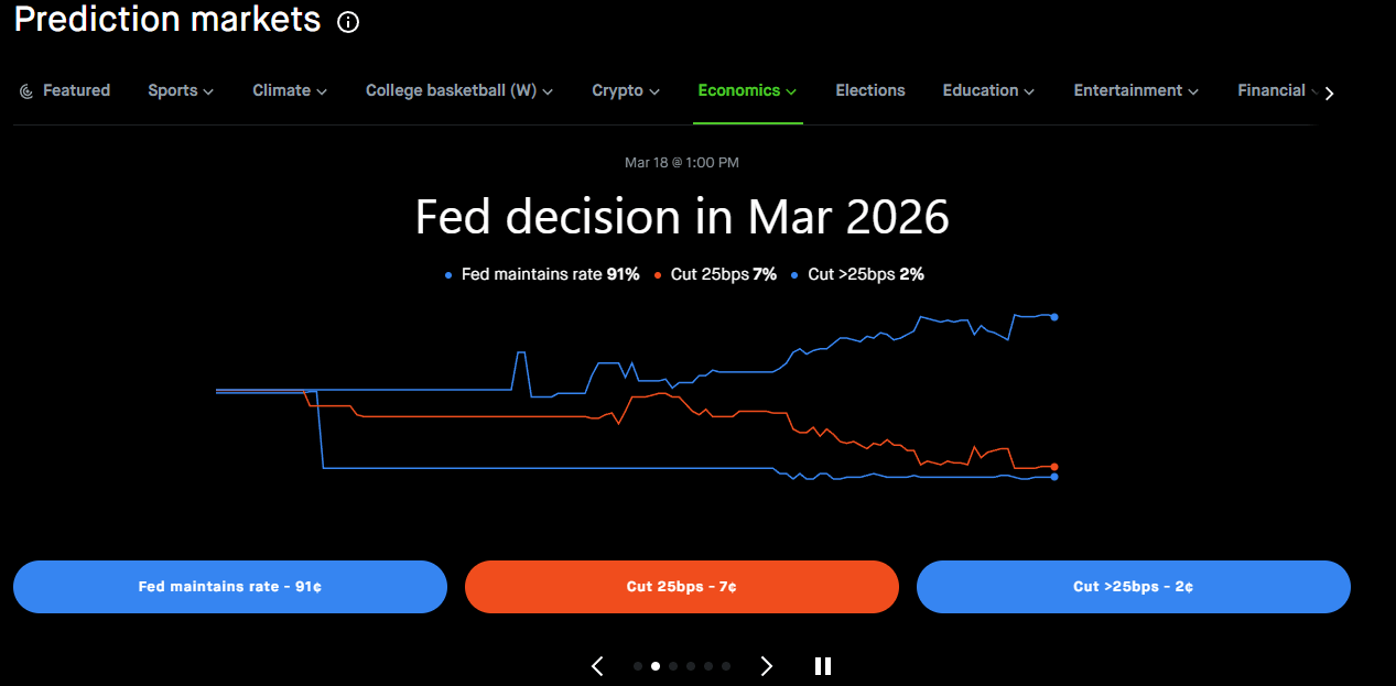 Robinhood's prediction markets hub offers a broad range of categories, with particularly strong depth in sports and economics. As of February 2026, the platform features over 400 active contracts across multiple event types, and trading volume has been surging, CEO Vlad Tenev reported 8.5 billion event contracts traded in Q4 2025 alone.