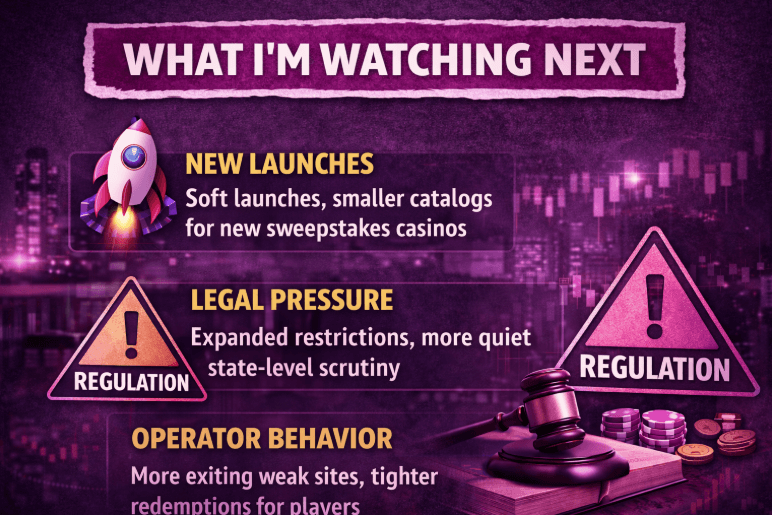 I’m watching how new sweepstakes casinos launch, not how many appear. The next wave is unlikely to look like the old “big bonus, everywhere at once” model. Instead, I expect: