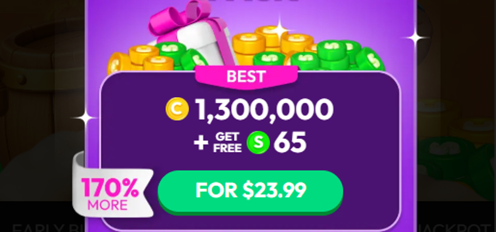 First Purchase / Match Bonus | Buy 1.3 million Crown Coins → get extra 65 Sweeps Coins (175% bonus) |