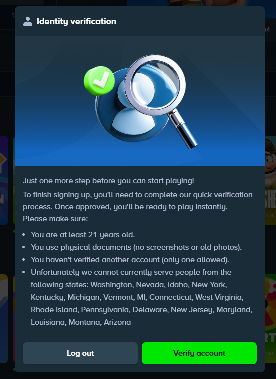 KYC (Know Your Customer) is a standard identity check used by reputable sweepstakes casinos to prevent fraud and ensure prizes go to the right person. You’ll typically need to pass KYC before your first redemption.