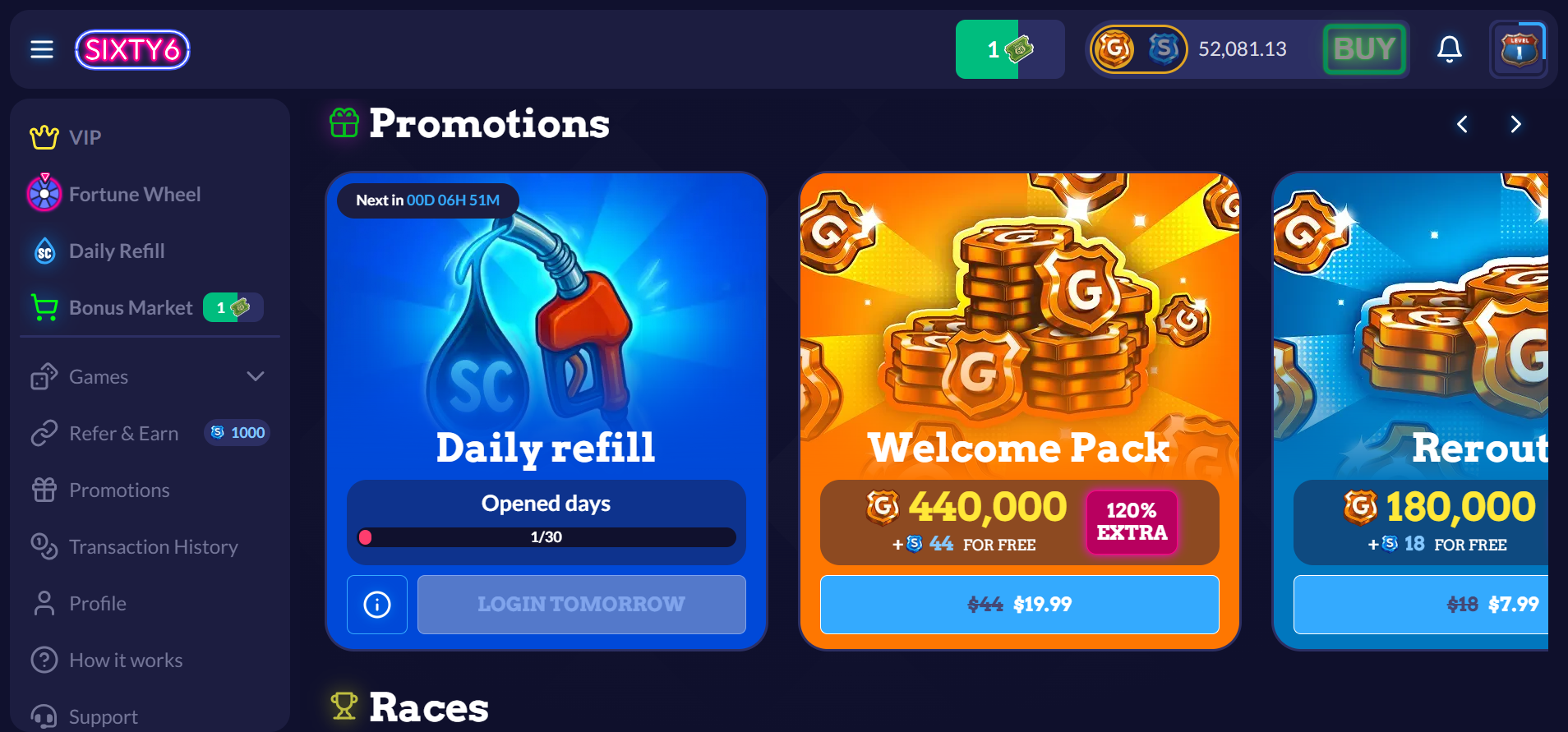 Ready to maximise your fun? Join Sixty6 Casino (Click here to join) and unlock a strong welcome pack of virtual Gold Coins plus redeemable Sweeps Coins. Start playing today and don’t miss the ongoing daily rewards and VIP perks.