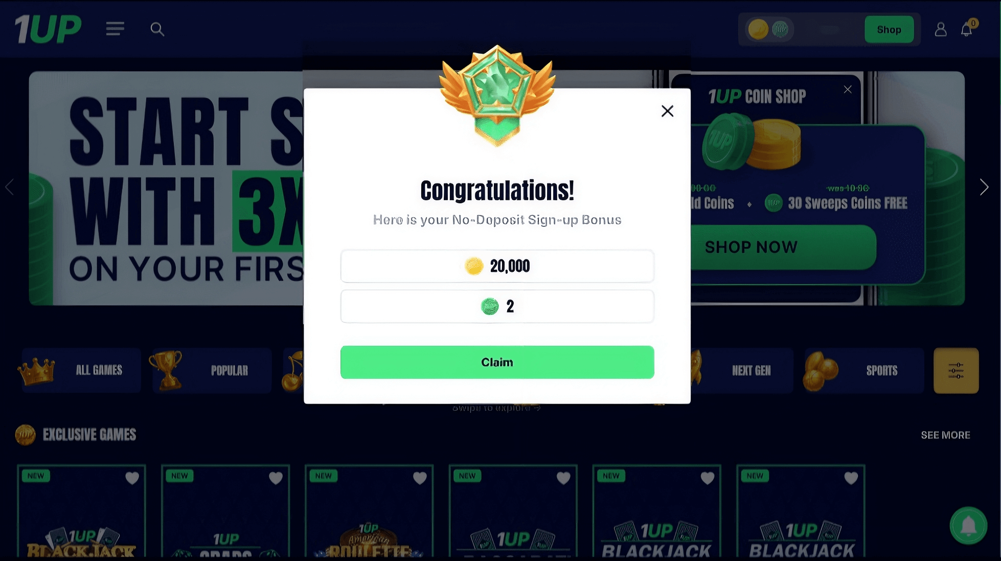 1UP does not run a classic Gold Coins plus Sweeps Coins welcome bundle like the big-name sweepstakes casinos, but it still gives new players a surprisingly generous pile of free-play currency to kickstart that slots madness feeling. When I signed up and started playing through the current build of the app, I was quickly funneled into free coin packages, level-up rewards, and timed promotions that delivered the equivalent of what many sweeps sites would frame as 2 SC and 100K Gold Coins in terms of playtime value, even though 1UP does not brand anything as redeemable Sweeps Coins or real cash prizes. Overall the welcome bonus stands at 20,000 Gold Coins + 2 Sweeps Coins