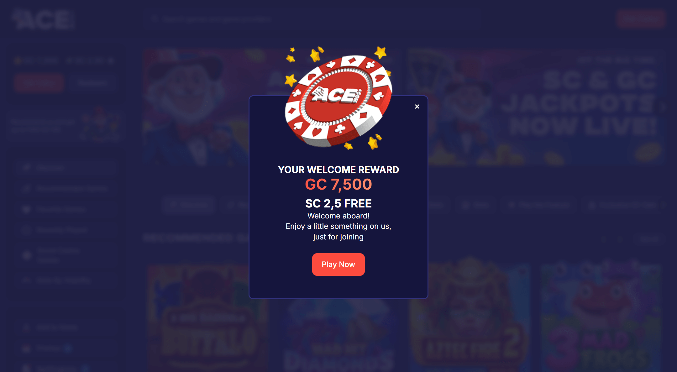 I started with a 7,500 Gold Coin + 2.5 Sweepstakes Coin (SC) no deposit bonus, above average for a sweeps launch. ACE’s “150% first purchase” gives the biggest initial SC top-up in the category, but there are currently no recurring daily offers, tournaments, or creative drops like the best slot machine to play alternatives. You do get SC for referrals, social contests, and with each GC purchase, and can mail-in for 4 SC daily. For better contrast check our bonus watch