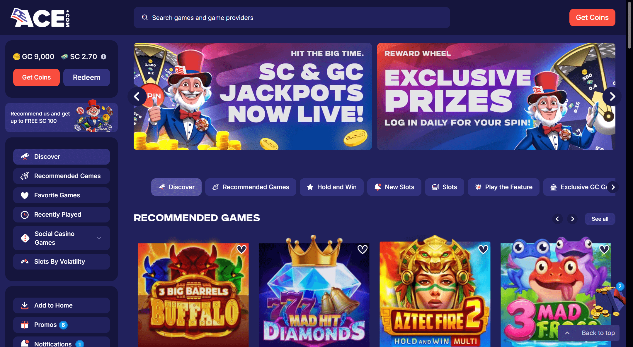 ACE Sweepstakes Casino Review: I joined ACE because of its sky-high reputation, and it felt like logging into a European flagship, but designed for US sweeps play. Scrolling the 700+ slot catalog, collecting sweeps coins for cash, and finding exclusive providers rarely seen at any competitor, ACE quickly proved it’s more than a premium domain. Still, it’s not for everyone, especially those who want nonstop promos or a big table/live game spread.