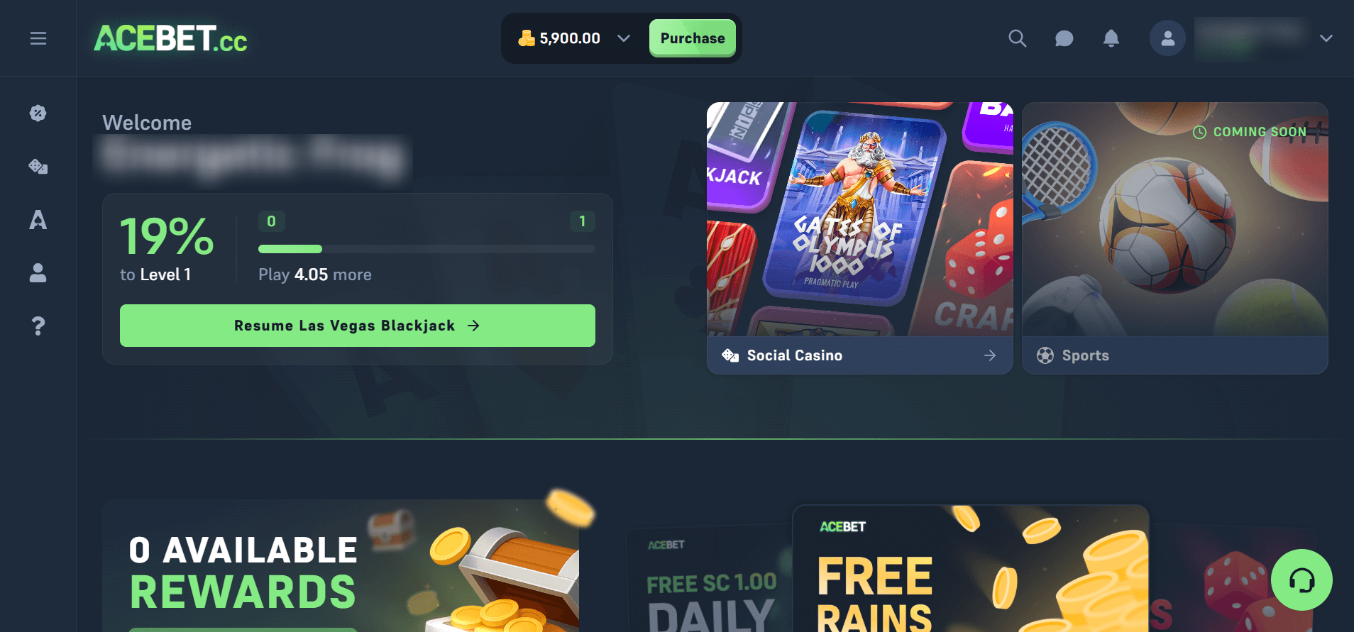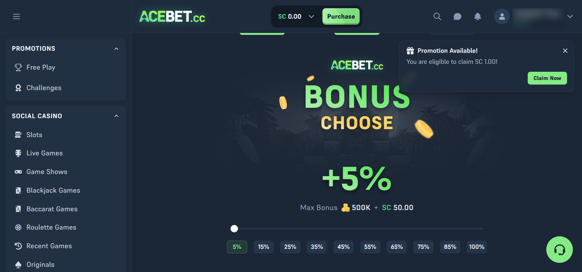 The Acebet welcome bonus delivers 1 free Sweeps Coin and 10,000 Gold Coins immediately after registration, no hoops to jump through, no extra work which I found refreshing coming from a new sweepstakes casino. While this won't break any records, the platform compensates with a 100% first purchase match up to 1,000 SC, valid for 24 hours after registration. I appreciated the sliding discount widget that lets you customize your bonus percentage anywhere between 1% and 100%, though procrastinators should note this time-sensitive offer expires quickly.