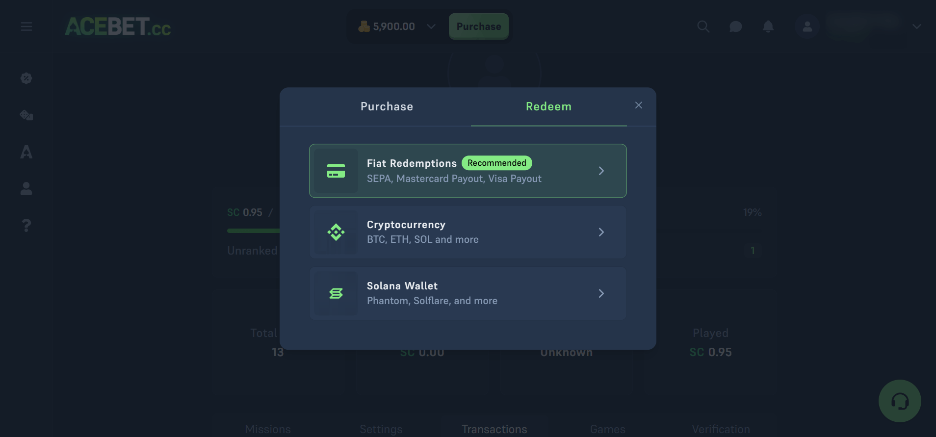 Acebet structures its loyalty program around Missions rather than traditional VIP tiers. The system rewards 25 different achievements, some recurring, from reaching player levels to completing redemptions. Hitting level 10 awards 3 SC, redeeming $50 grants 2 SC, and making your first purchase triggers additional bonuses.