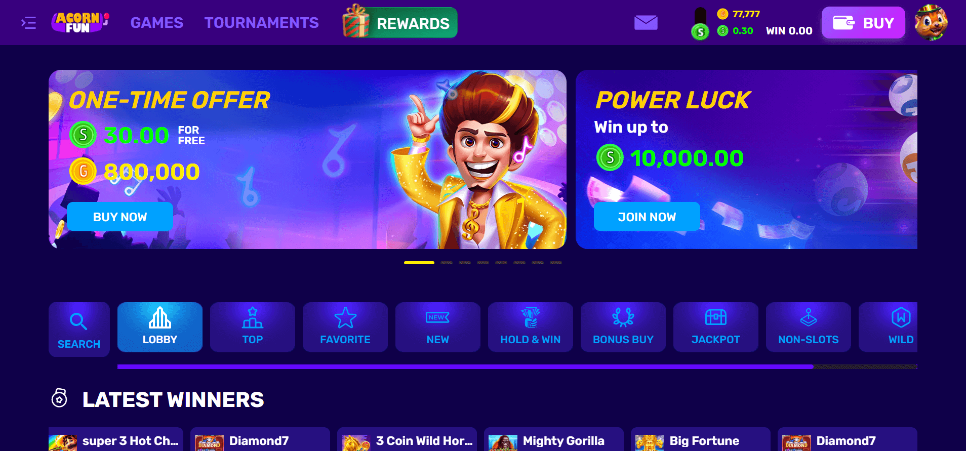 The Acorn Fun welcome package delivers 77,777 Gold Coins + 0.30 Sweeps Coins upon registration, no promo code required. I found this offer underwhelming compared to competitors, particularly with the minuscule SC allocation that barely allows for meaningful gameplay on higher-stakes slots. The bonus activates immediately after email verification, giving instant access to the full game library with a standard 1x playthrough requirement on Sweeps Coins.
