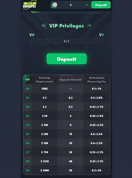 Big Cash Sweeps runs a hard-edged 10âtier VIP ladder from V0 to V9, and progress is locked behind specific realâmoney ârechargeâ requirements rather than gameplay alone. The only tangible perk that scales with each tier is a reduction in redemption processing fees, which means players are essentially paying more upfront just to be charged slightly less for withdrawing their wins. Again, I absolutely hate this setup and this must be one of the worst VIP schemes available.Â
