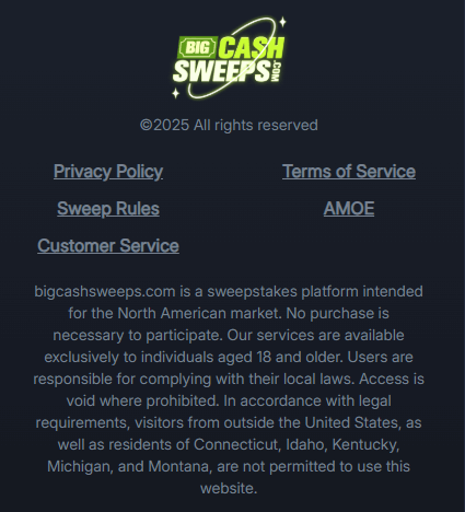 The footer states that bigcashsweeps.com is a sweepstakes platform intended for the North American market, that no purchase is required to participate, and that services are available only to individuals aged 18 or older. It further explains that access is void where prohibited and that visitors from outside the United States, as well as residents of certain states including Connecticut, Idaho, Kentucky, Michigan, and Montana, are not permitted to use the website. This language broadly aligns with sweepstakes norms but is still less precise than the fully itemised restrictedâstate lists now standard on topâtier sweeps sites.