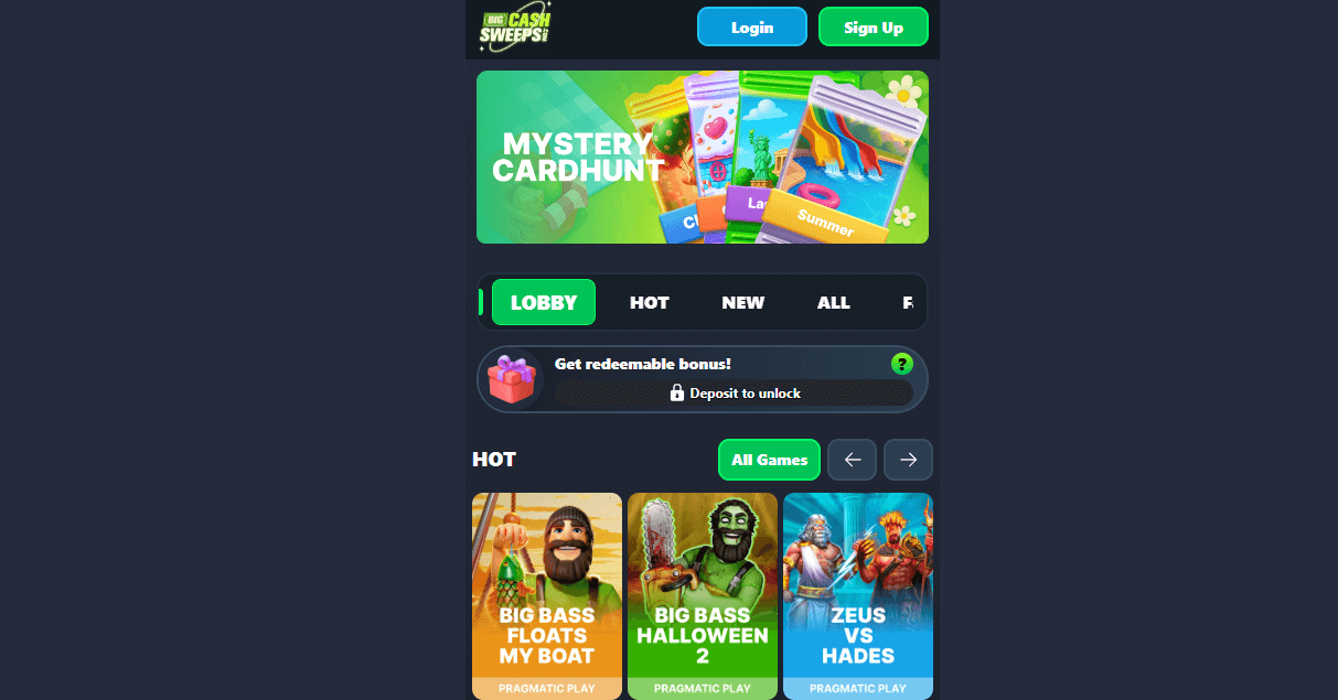 From the moment the lobby loaded, Big Cash Sweeps felt like a nearâclone of the Sweeps Blast experience: bright slot tiles, a promo carousel packed with SC multipliers and redeemable bonuses, and persistent âdeposit to unlockâ prompts that intruded on basic navigation. The slot quality itself was fine, but the interface constantly tried to steer attention back to offers instead of letting gameplay breathe, which quickly became tiring.