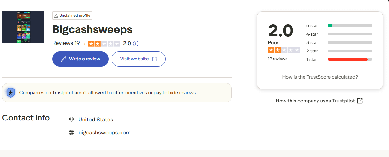 Big Cash Sweeps has a poor reputation on consumer review platforms: its TrustScore hovers around 2/5, with only one of roughly 19 reviews rating it higher than 1/5, and even that lone positive review looks questionable compared with the overwhelming volume of negative feedback. Most reviewers complain about failed cashouts, opaque rules, and the requirement to buy before getting access to redeem, echoing the structural issues already discussed above.