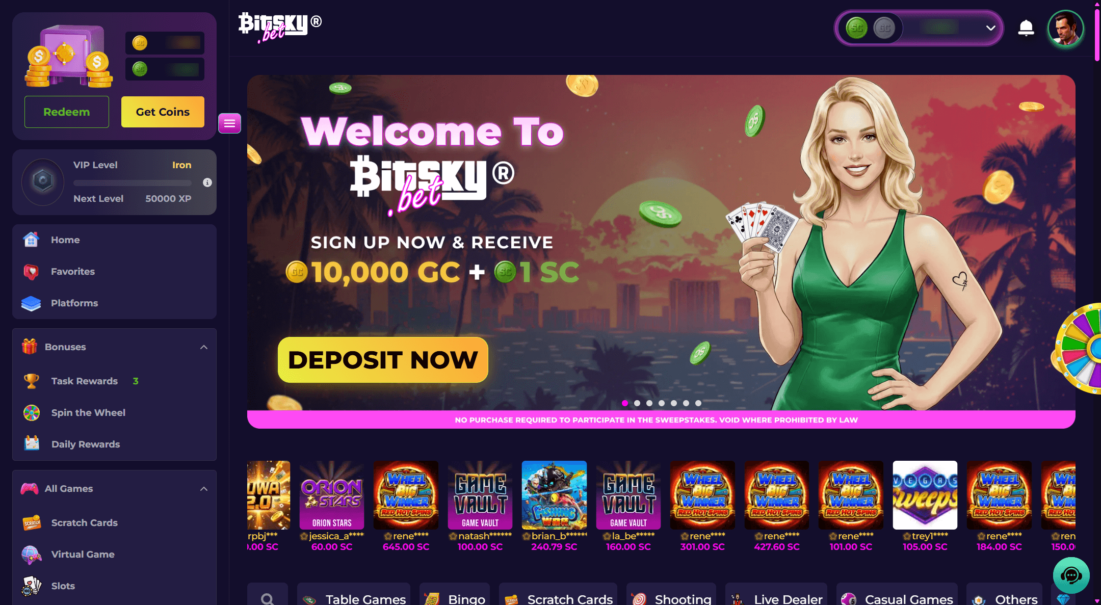 The welcome offer at Bitsky gives 10,000 Gold Coins and 1 Sweeps Coin after email verification, no promo code needed, which let me jump straight into action. I appreciated the 50% first-purchase discount on select packs, but daily logins start small at 0.05 SC unless you streak, building to better rewards over seven days. The wheel spins for up to 5 SC at bronze level, yet I found tasks requiring 25 SC spins a bit grindy for casual play.