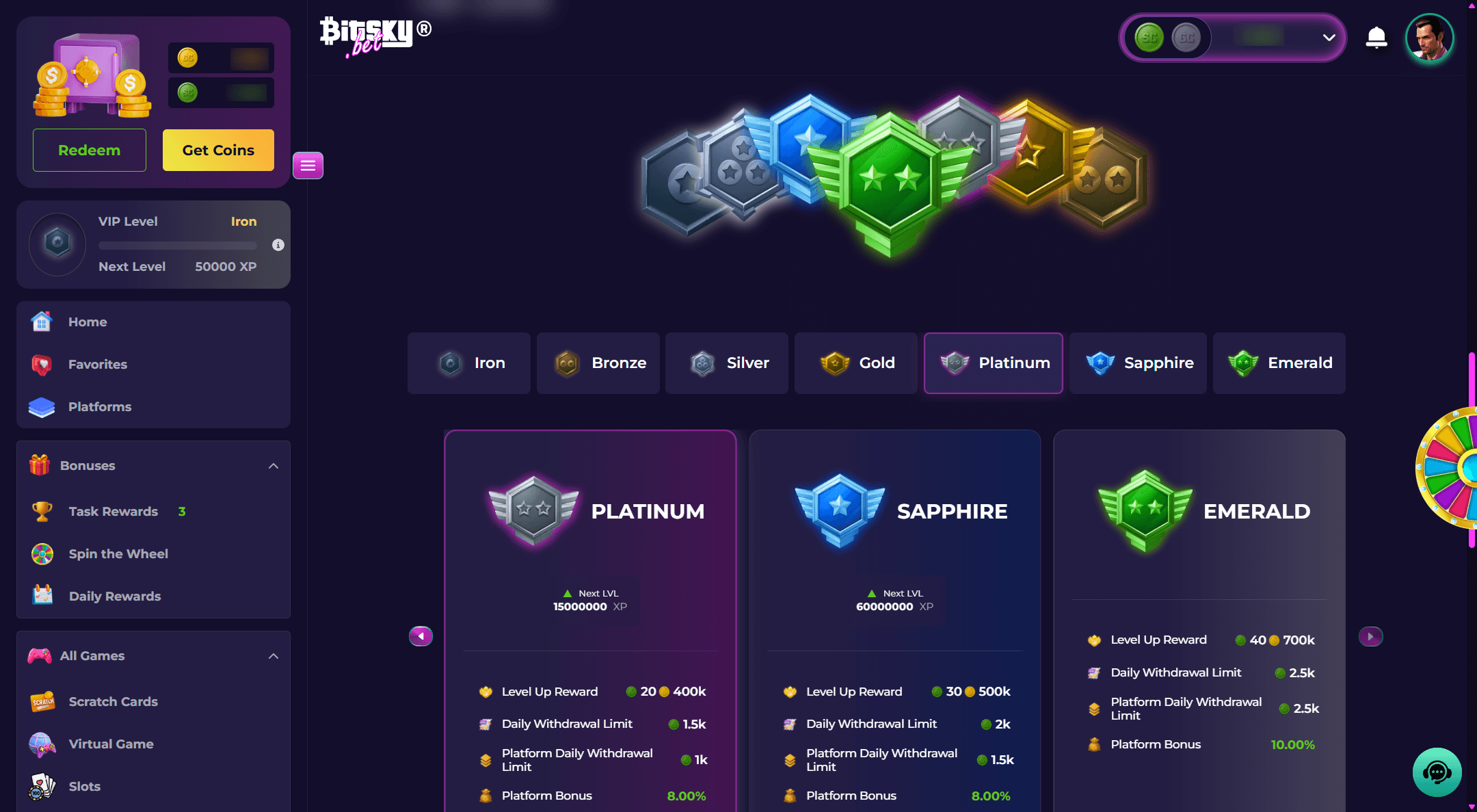 Bitsky offers a six-tier VIP program starting from Iron, earned automatically through play with points from wagers (1,000 GC or 1 SC = 1 point). Higher tiers unlock better wheel levels, rakeback, and bonuses, but details on exact requirements feel vague without clear progression trackers during my time there. I reached early tiers quickly, yet benefits seemed incremental rather than transformative.