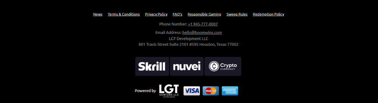 BoomWins describes itself as a social casino platform and is associated with LGT Development LLC, with addresses listed at 801 Travis Street Suite 2101 #595 Houston, Texas 77002 and LGT Venture LLC as a backend provider, but it does not advertise formal gaming licences. Instead, it relies on the sweepstakes model where Game Tokens have no cash value and Sweep Tokens function as entries into prize drawings, aligning with the approach used by other LGT-operated sites such as CosmoSlots.