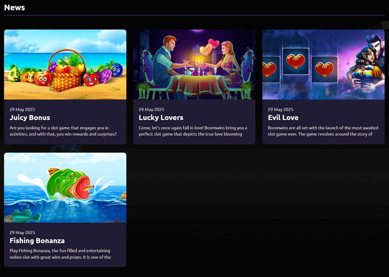 BoomWins invests heavily in promotional copy about fairness, innovation and fun, with landing sections explaining why it ârevolutionizes social casinosâ and highlighting categories like Fish Frenzy, Jackpot Mania and Card Sharks, yet actual community tools are fairly thin on the ground. There is no visible in-lobby global chat or public Discord/Telegram community, and the site instead leans on marketing-style blocks and a News section that reads more like a blog of new slot launches than a two-way player hub.