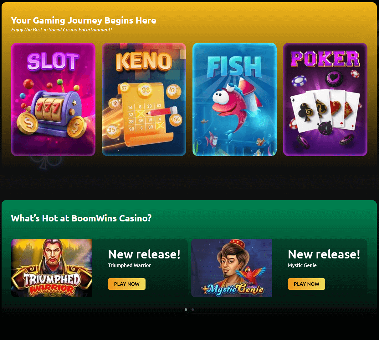 BoomWins is a brightly lit social casino operated by LGT Development LLC, a Texas-based company that also stands behind CosmoSlots and similar sweepstakes platforms, positioning itself as a fun-first slot destination with keno, fish games and a basic poker tab on the side. It runs as a dual-currency social casino where Game Tokens (GT) are used for entertainment play and Sweep Tokens (ST) act as the prize-eligible sweepstakes currency. In practice, the lobby looks slick and there are enough slots to keep a casual player occupied, but once bonuses, AMOE visibility and long-term value are weighed against the wider market, BoomWins feels more like a cosmetic clone than a serious contender among the best sweepstakes casinos.