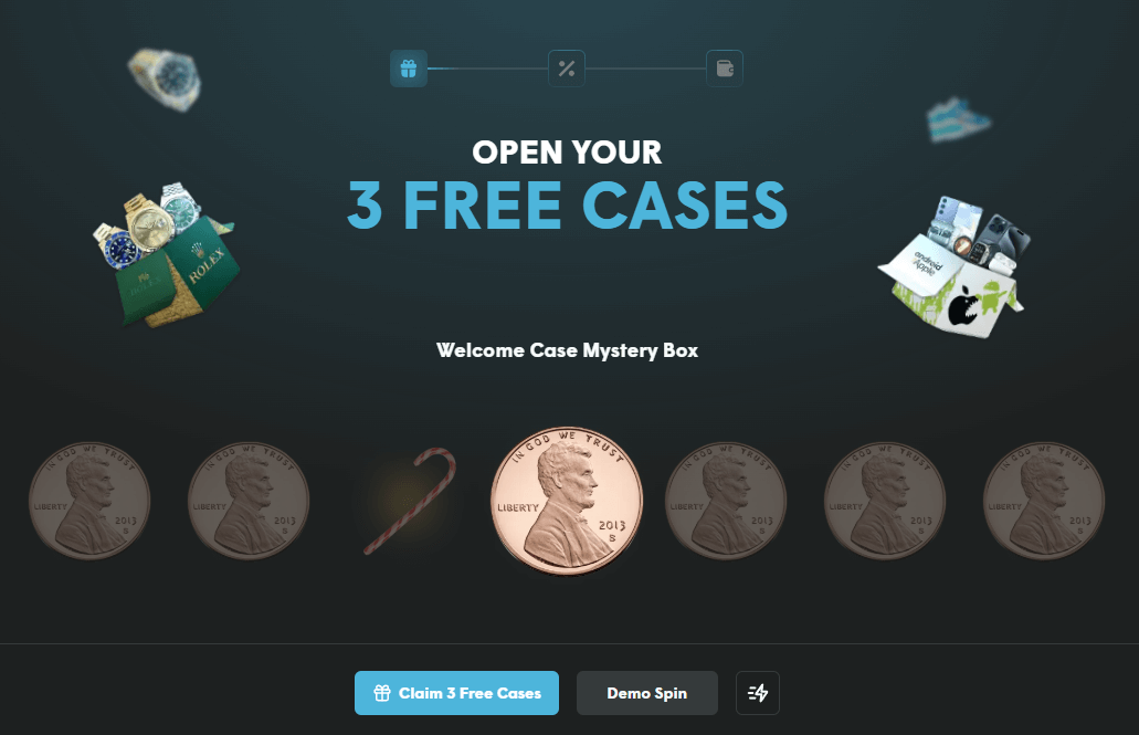 | No-deposit signup | 5,000 Gold Coins + 3 free mystery boxes. | Gold Coins are play-only; prizes from free boxes follow Cases Cash redemption rules. | Available on registration; boxes must be opened within the promo period shown on site. | Boxes can drop physical prizes or Cases Cash; odds per item visible before you spin. |