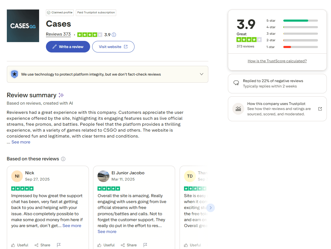 Overall, I enjoyed the platform, but I would not pitch it as a value grinderâs site. Serious sweeps players who care more about RTP, classic games, and exhaustive responsible-gaming tools will likely prefer established Sweepstakes as their main home and keep Cases.gg as a highâvolatility side project.