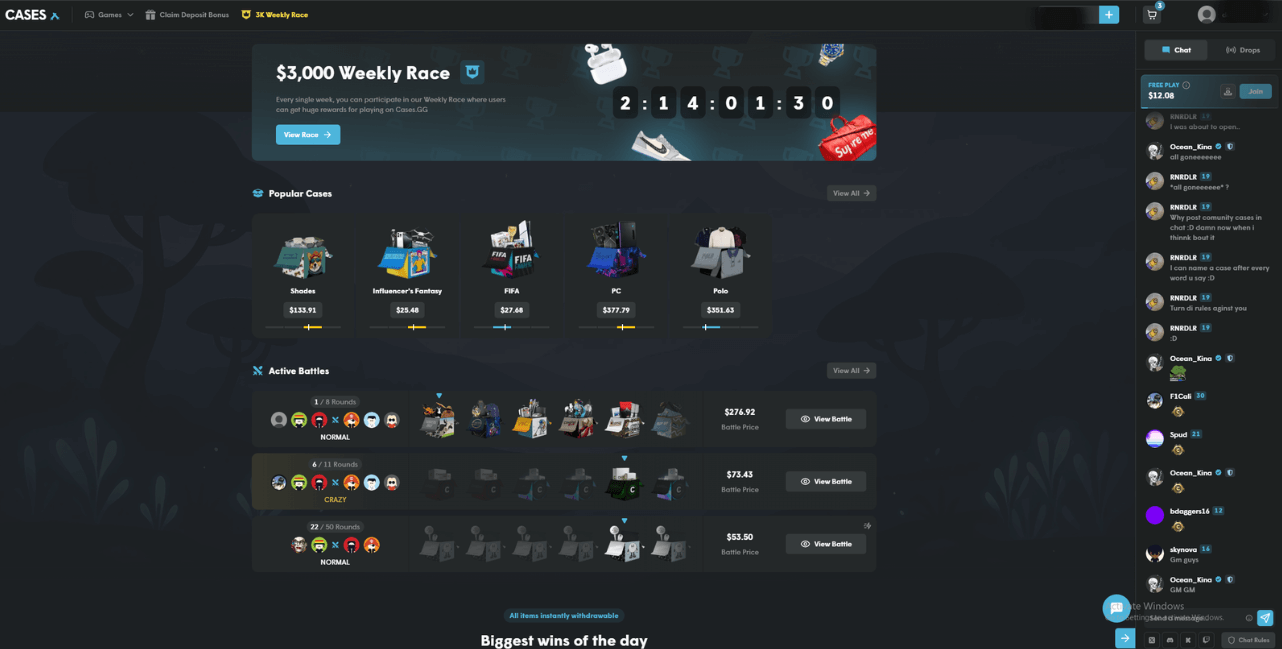 The Cases.gg lobby looks and feels social-first: live chat hugs the right-hand side of the screen, showcasing player drops and banter, while the centre display cycles popular boxes, active battles, and the weekly race banner. Big win cards highlight the dayâs largest pulls, from sneakers and jewelry to âcasino slot machineâ pendants.