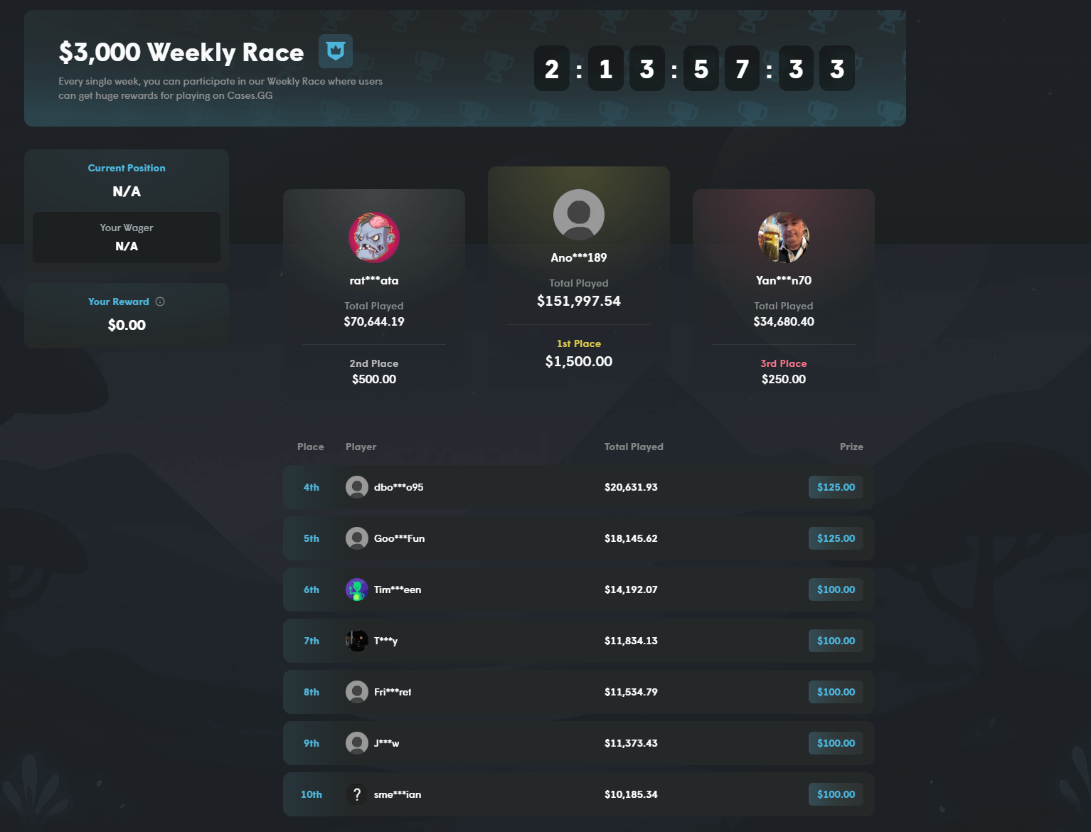 | $3,000 weekly race | Leaderboard based on total Cases Cash wagered each week. | Top spot around $1,500, with smaller prizes down the table. | High-volume feature; only worthwhile if you are already opening many boxes. |