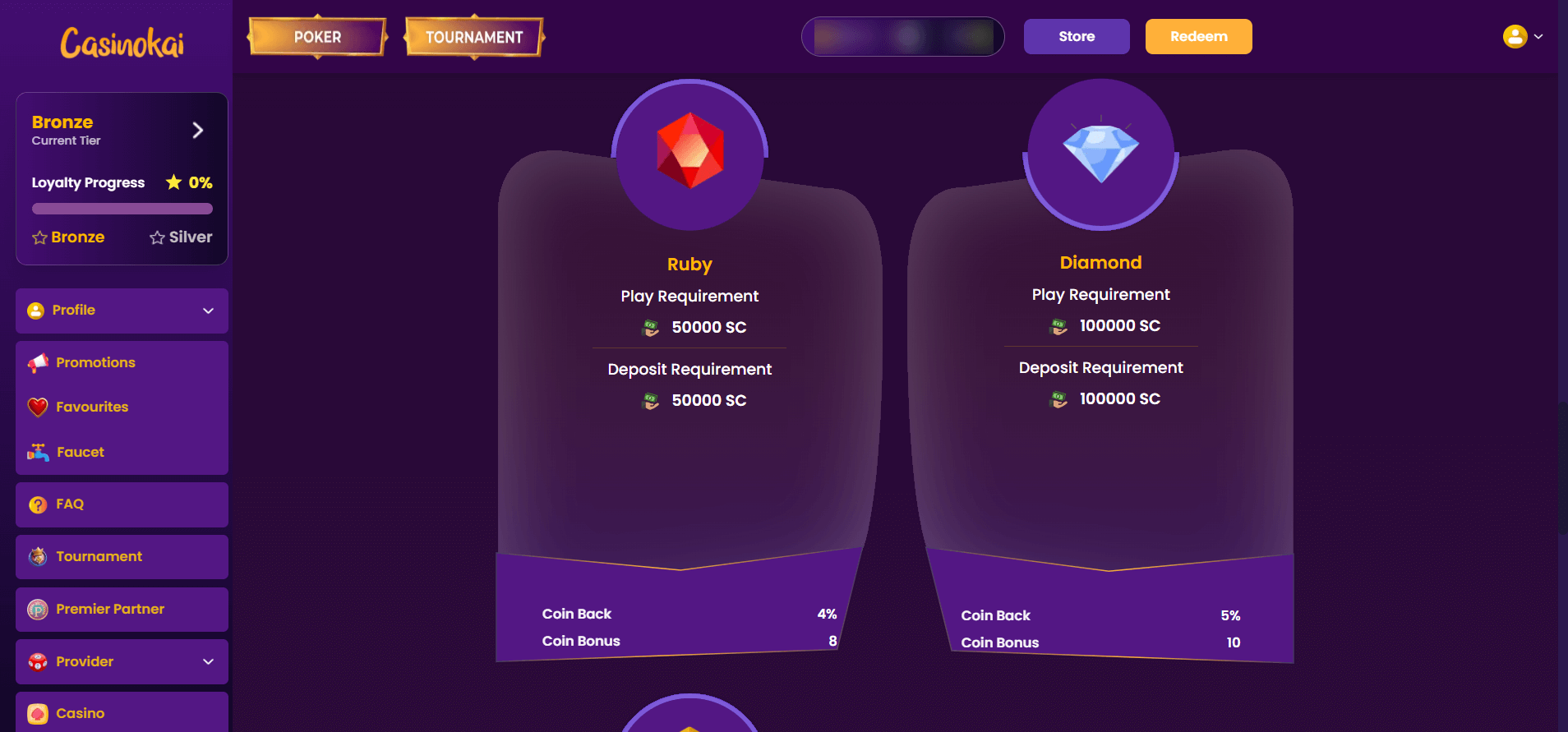The CasinoKai VIP Club operates on a seven-tier system with CoinBack rewards and level-up prizes, though the benefits feel underwhelming compared to established competitors. The structure ranges from entry-level Bronze through Silver, Gold, Platinum, Ruby, Diamond and Pinnacle tiers. Players earn points through wagering activity, with both Gold Coins and Sweeps Coins contributing to progression, though the exact conversion rate wasn't clearly stated in my testing. Here's the full breakdown of how the VIP Club works at CasinoKai: