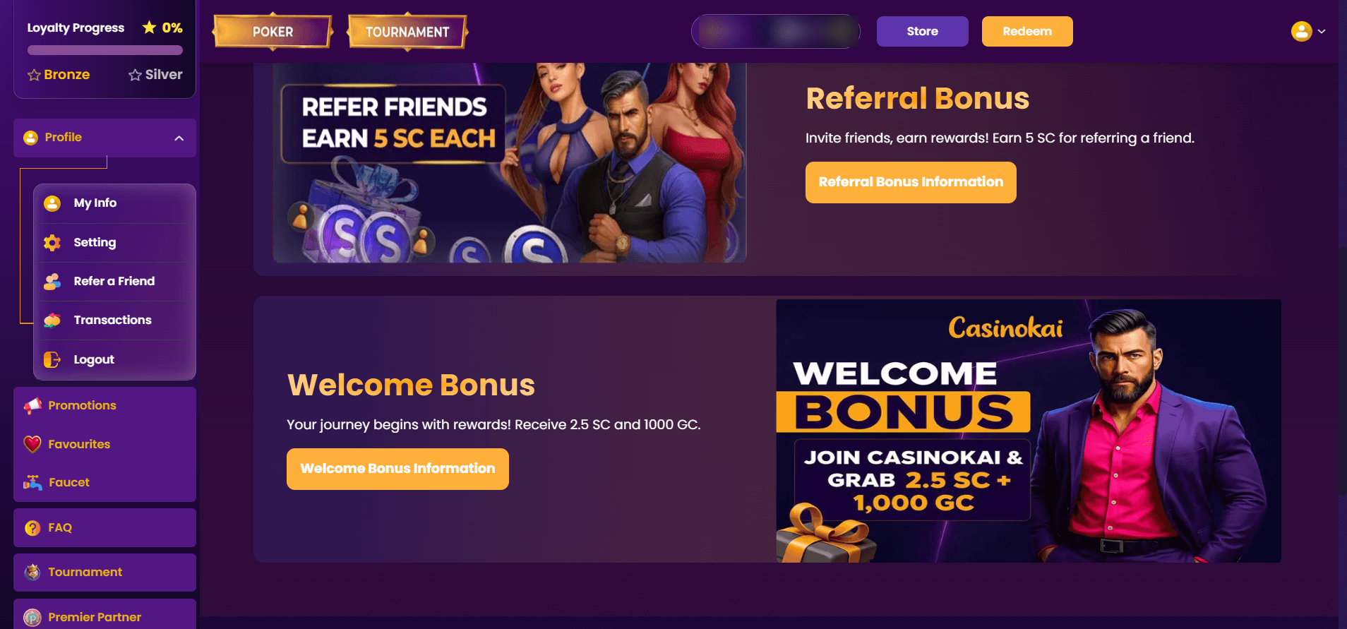 | Referral Bonus | 5 SC per Friend | 2x on bonus SC | Upon referral verification | All games | 5 SC per verified referral |