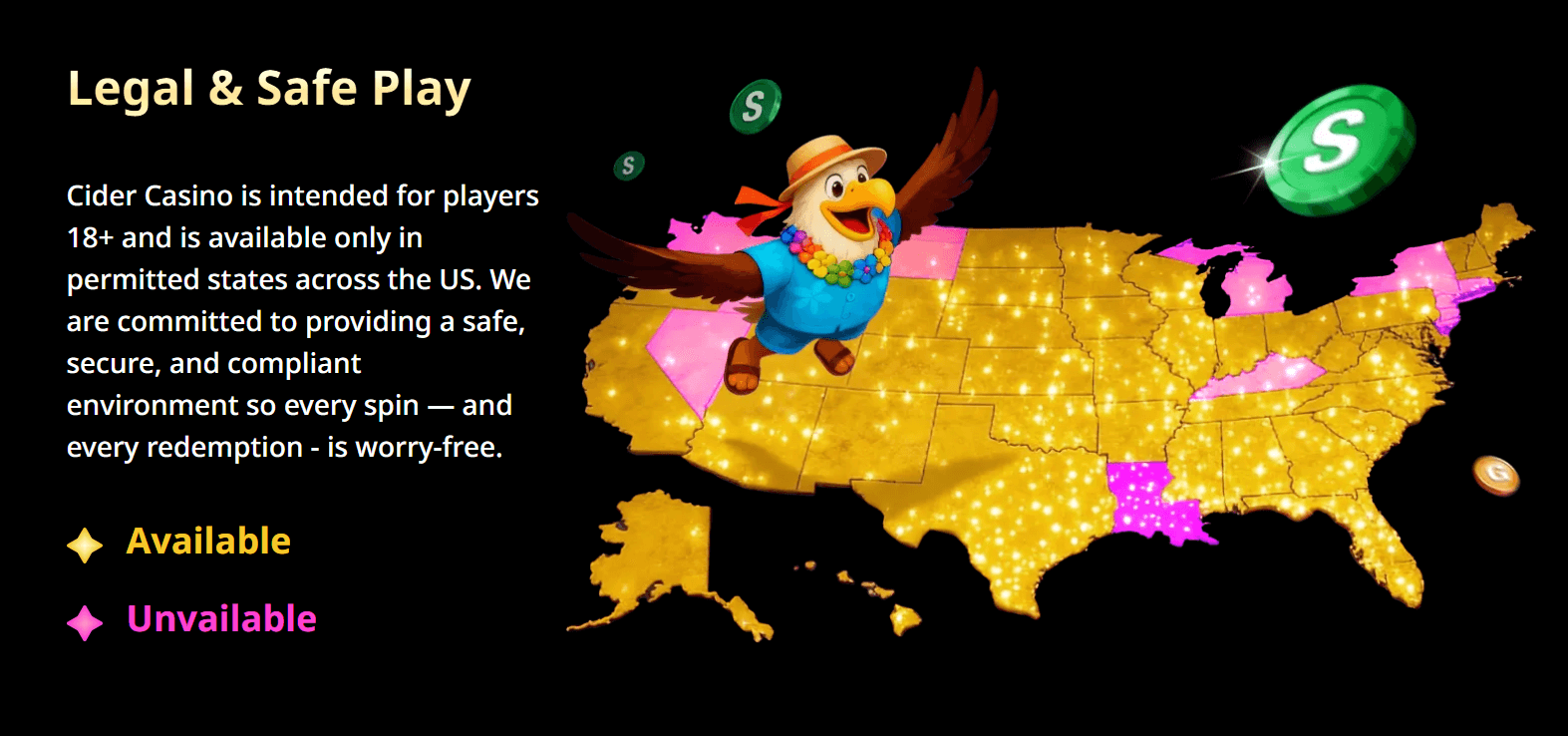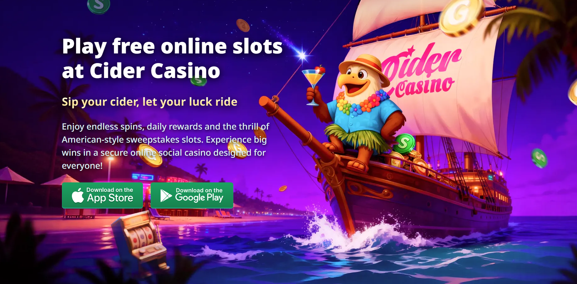 Cider Casino follows the sweepstakes social-casino model. That means it is designed as an entertainment platform, with a promotional prize system wrapped around the games. You can acquire sweepstakes coins without making a purchase, and purchases are always for entertainment coins rather than direct real-money bets.
