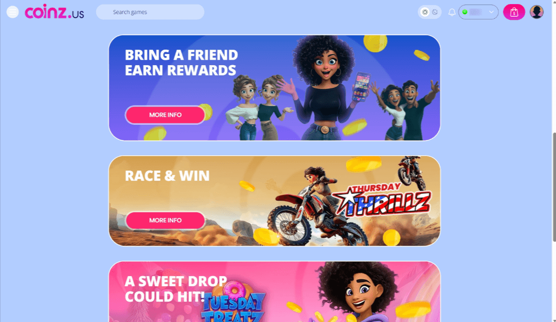 On desktop, Coinz.us feels clean, modern, and responsive, which made my extended test sessions enjoyable even when I was just browsing games without a specific favorite in mind. The main lobby keeps navigation simple, with smart use of categories and search tools that prevented the 500 plus game count from becoming visually overwhelming.