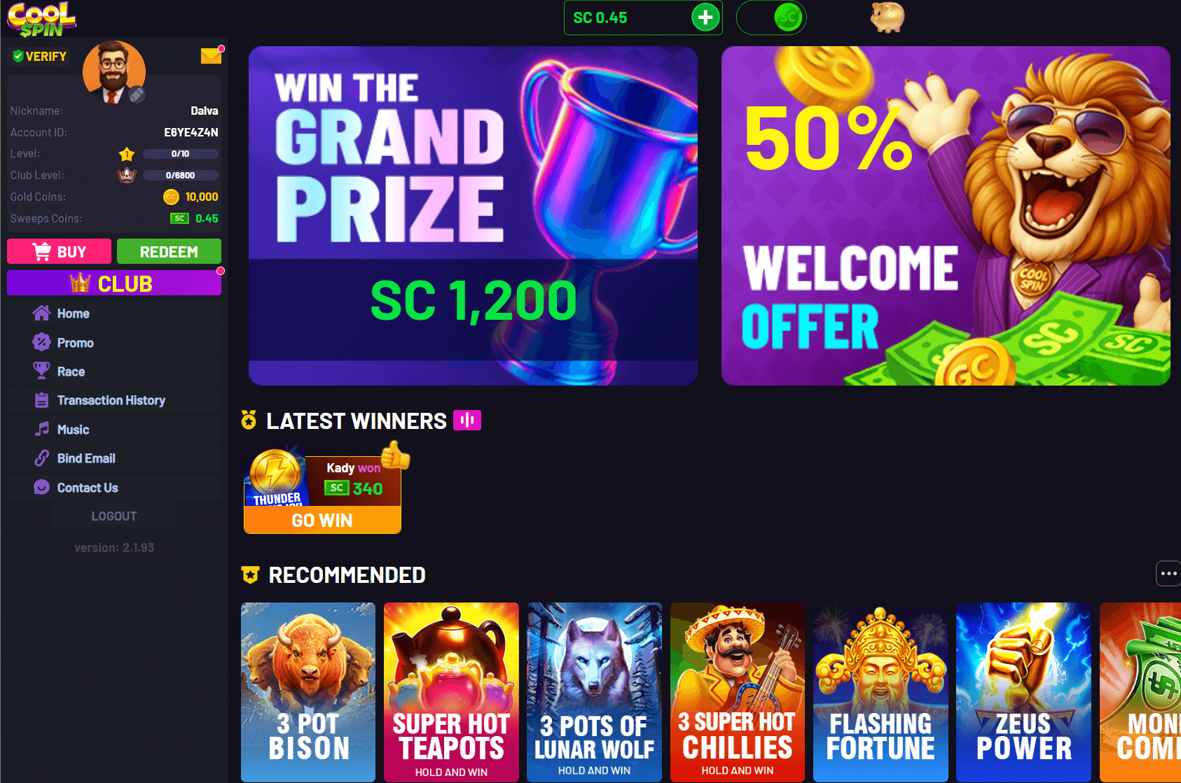 Cool Spinâs marketing leans on four pillarsââTwo Ways to Playâ, âPromotions & Bonusesâ, âFast Redemptionâ and a public âWinning Boardâârather than flashy wheels or chests. Daily logins, social code drops and occasional races keep things ticking along, but the reward system is simple and gets repetitive quickly compared with missionâdriven systems at more advanced new sweepstakes casinos.