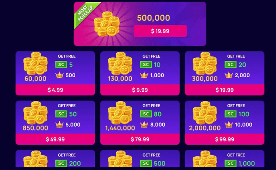 The shop sells GC bundles with free SC and âcrownâ points, such as 60,000 GC + 5 SC for $4.99, 130,000 GC + 10 SC for $9.99, and 300,000 GC + 20 SC for $19.99, scaling up to millions of GC and 100+ SC at higher prices. Common methods like cards and PayPal are supported, and while 1 SC is broadly treated as roughly 1 USD in redeemable value, the high possible playthrough on promo SC makes packs less attractive than they first appear.