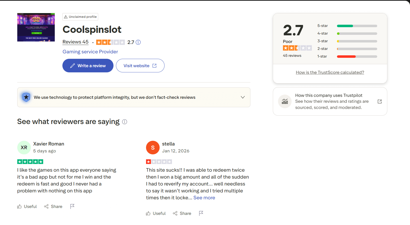 My assessment:Â Cool Spin Slots is not a trustworthy site. I would recommend you play elsewhere. You can find trusted sites curated by us at Funded Peaks in our Golden Picks selection.Â