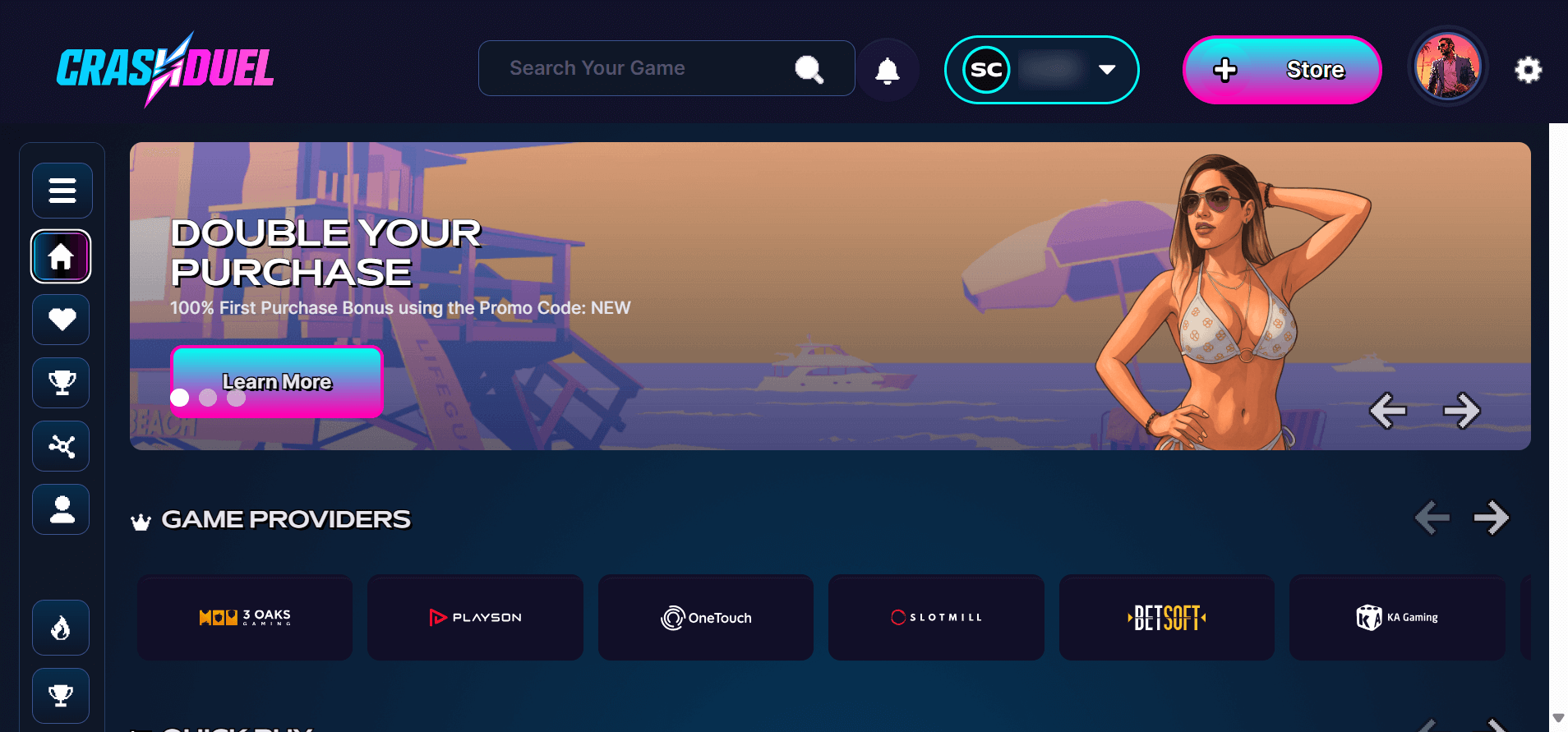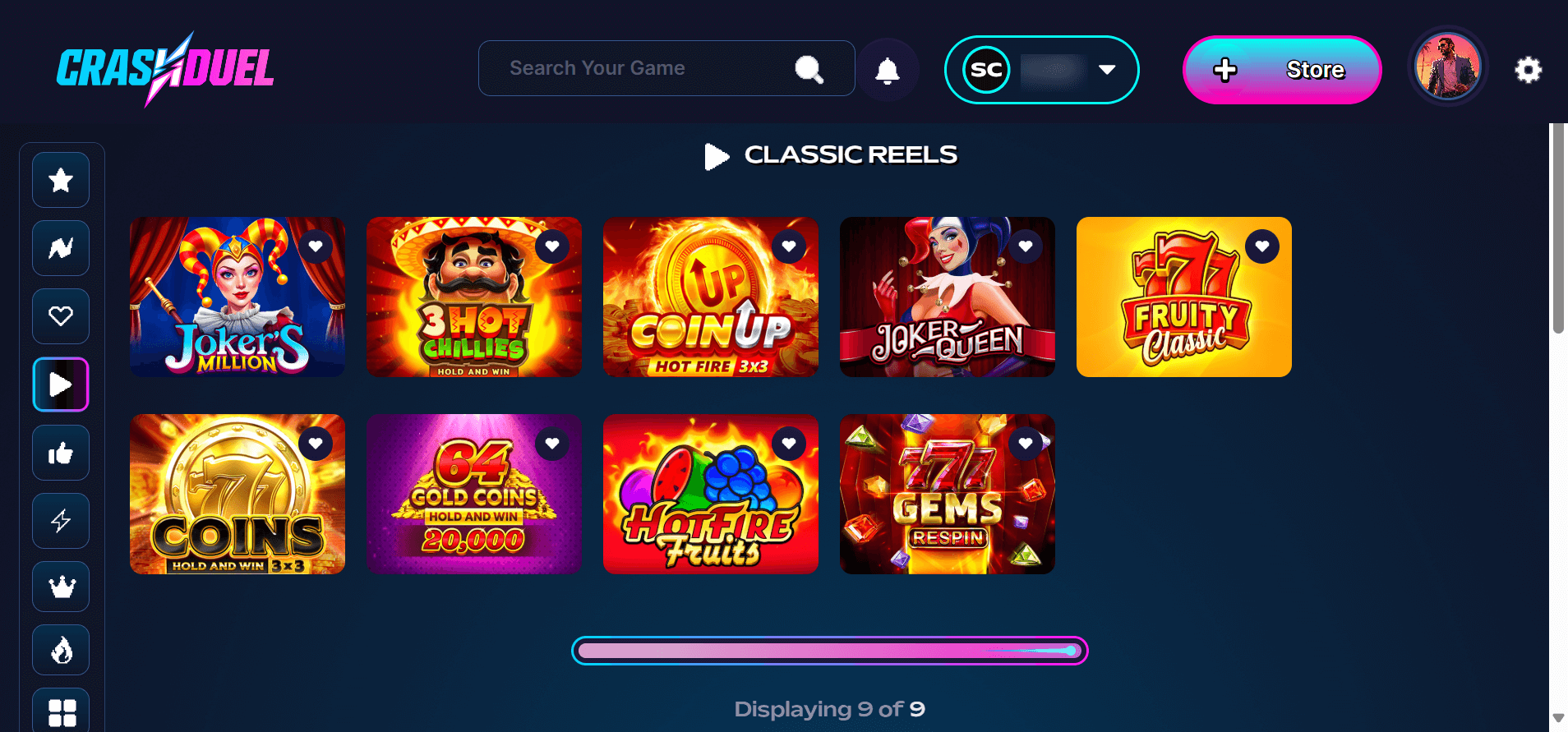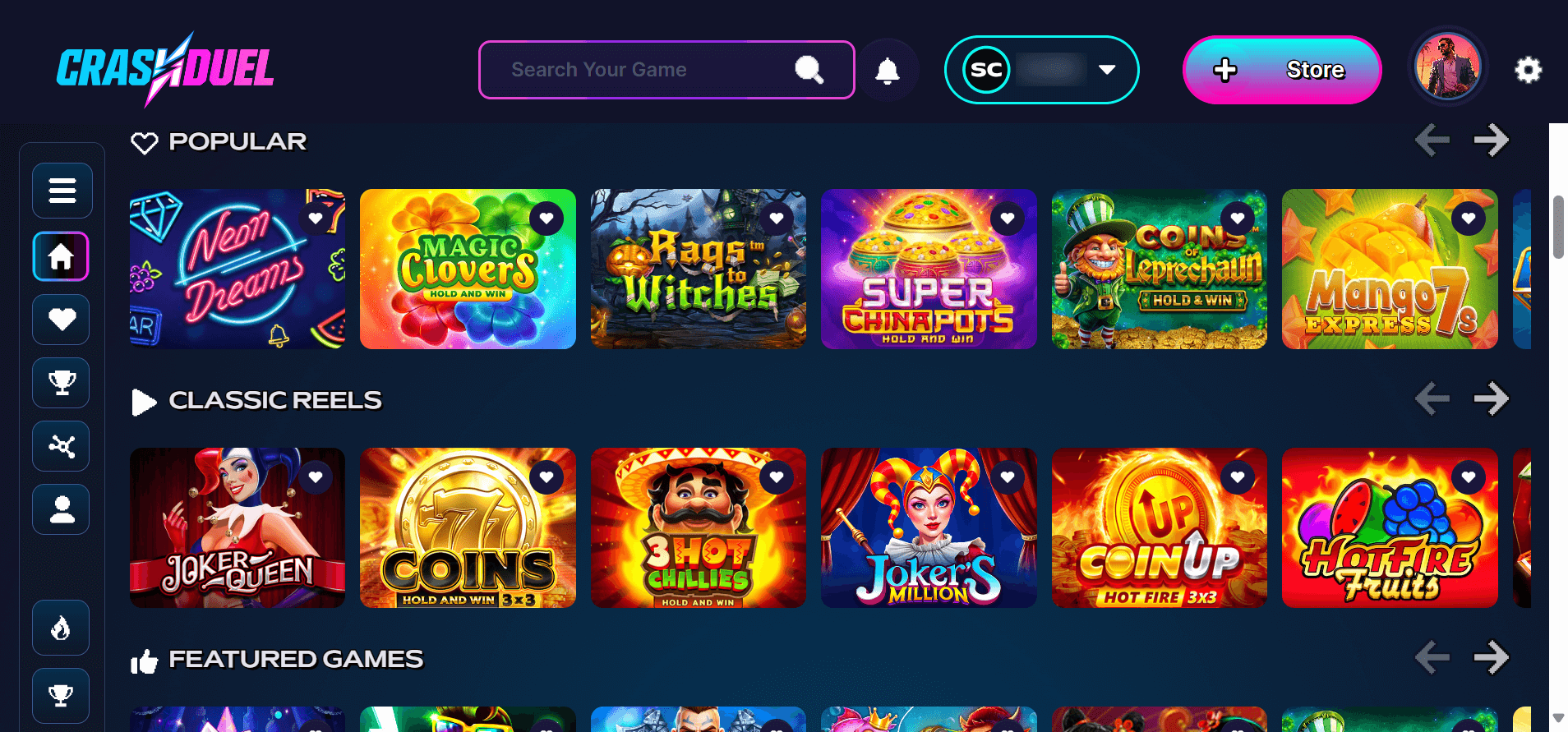 Speaking of the games, the catalogue on Crash Duel is a finely curated buffet of only the best. Classics and original titles pepper the site, making sweep veterans feel at home but also keeping things refreshing with exciting new games. When I ran out of cash and it came time to reload, I was floored by the simplicity and reliability of the purchasing and redeeming options.