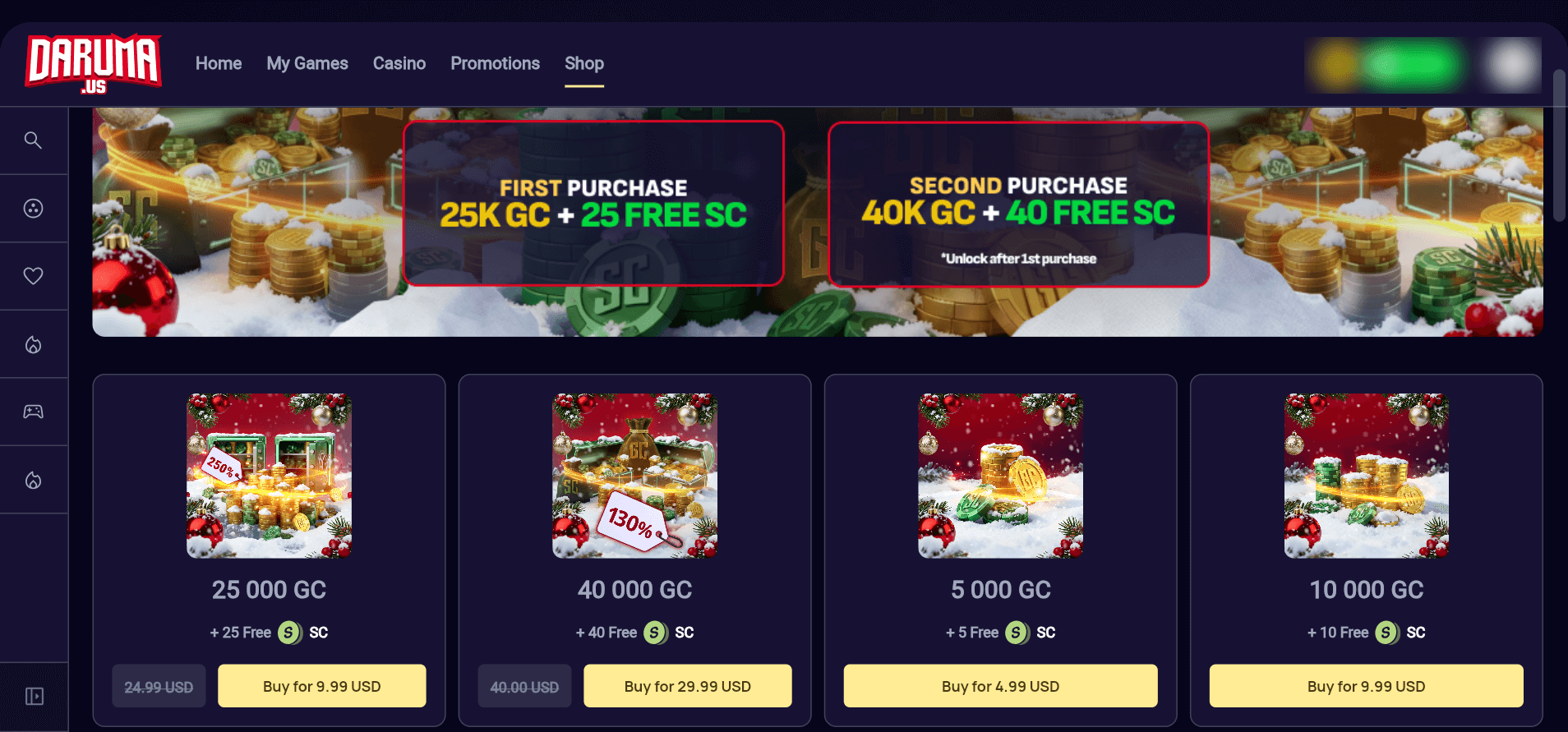 The standout value emerges with the first purchase bonus, 25,000 GC + 25 SC for just $10, or the enhanced 40,000 GC + 40 SC for $20. These represent legitimate value propositions that position new players for extended gameplay sessions across Daruma's premium game library. The 1x playthrough requirement on bonus Sweeps Coins maintains industry standards without introducing predatory rollover terms.