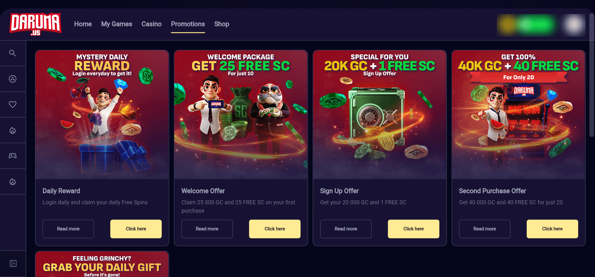The Daruma.us redemption experience presents a mixed bag of player-friendly minimums offset by concerning processing timelines that require serious consideration before committing significant gameplay hours. The platform operates with standard Gold Coins (entertainment only) and Sweeps Coins (redeemable 1:1 for USD) following the industry-standard dual-currency model.