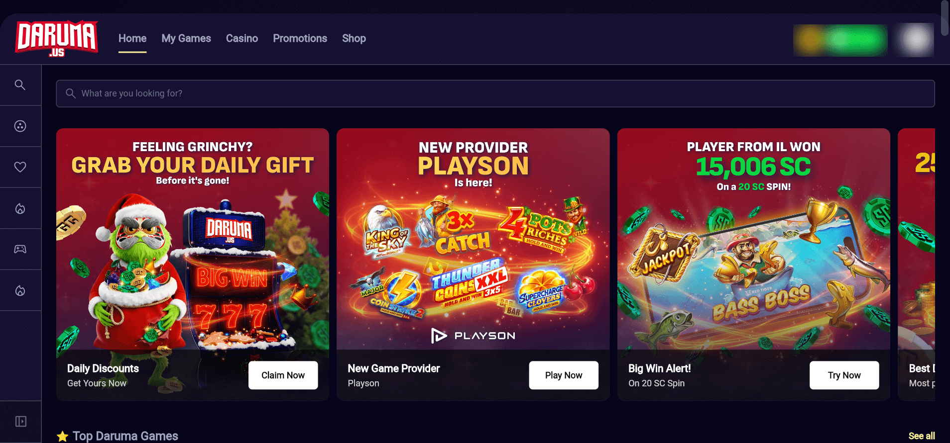 Daruma.us enters the sweepstakes casino space with a stripped-down approach that prioritizes premium game providers over flashy promotions. What caught my attention immediately was the curated selection from industry heavyweights like Evolution, Big Time Gaming, and Hacksaw Gaming, brands that don't typically appear together on newer platforms. The clean, minimalist interface feels refreshing in an industry cluttered with overwhelming bonus popups, though this simplicity comes at a cost, there's no VIP program, no referral bonuses, and limited daily rewards that leave serious players wanting more.