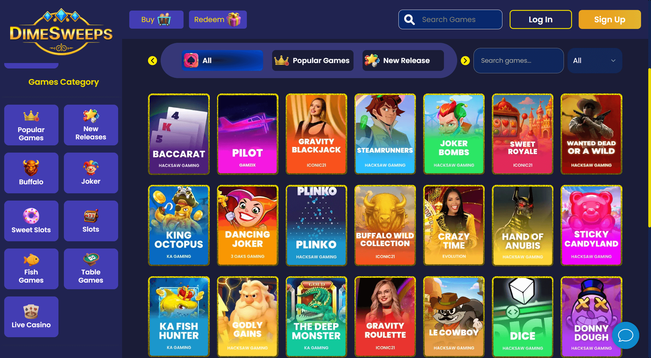 I spent several days exploring every major category. DimeSweeps boasts +3,000 sweepstakes titles, ranging from classic slots (like Godly Gains, Le Cowboy, and Trendy Jokers) to instant-win games (Plinko, Dice, Pilot) and authentic live dealer tables that run almost 24/7. The slots library organizes thematics much better than most sweepstakes casinos, filters for buffalo, candy, joker, etc. make discovery easier, though the absence of some recent mechanics like cascading reels may disappoint slot perfectionists.Â