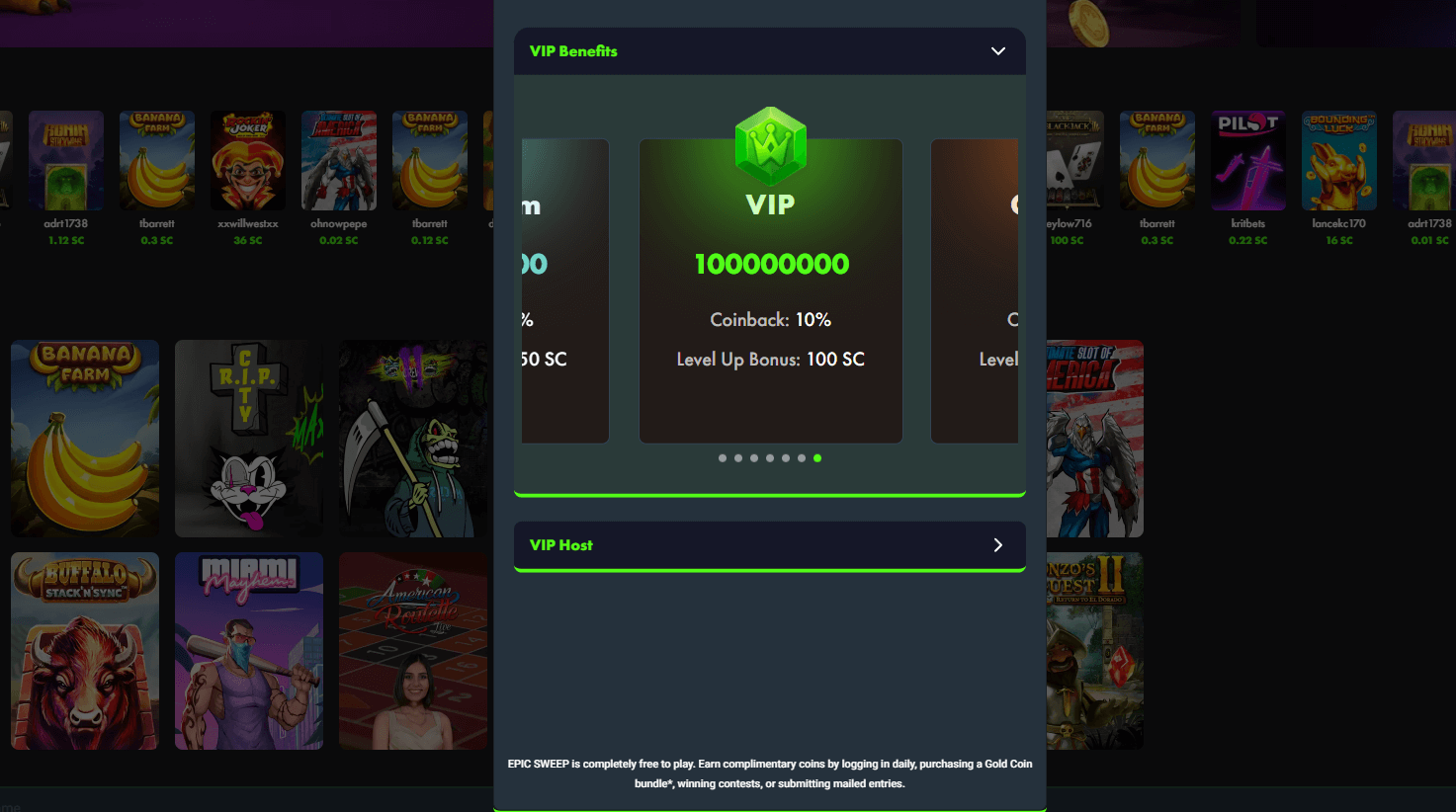 Epic Sweep feels modern, and most importantly, it feels consistent. The wallet is easy to understand, the split between Gold Coins and Sweeps Coins is clear, and the VIP path is presented like an actual ladder rather than a mystery box.