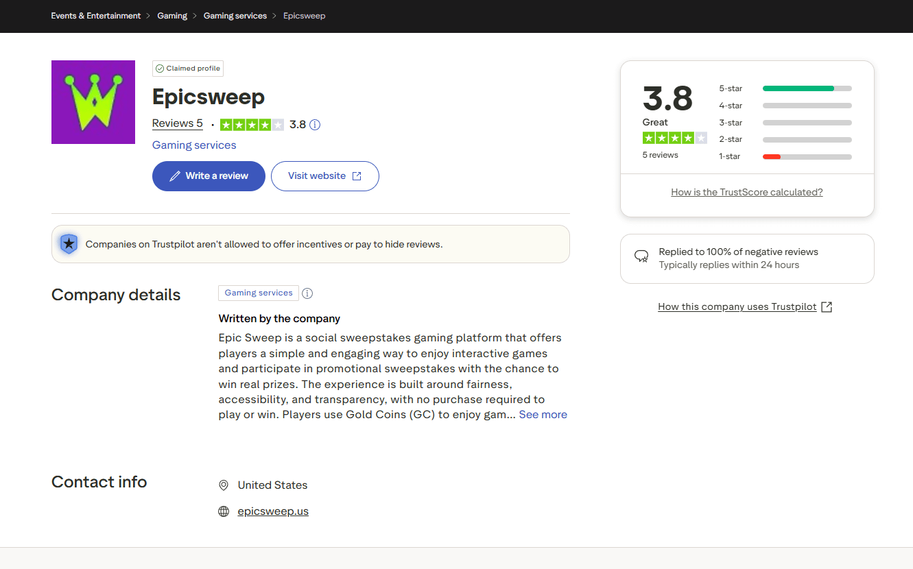 As a newer Sweepstakes Casino, Epic Sweeps are sitll establishing their reputation, which is normal. There are not a great deal of reviews on TrustPilot, however, below is a mix of comments that I have verified. Since Epic Sweeps is not fully established yet I would use it with caution. It shows great promise, but if you want to be on the safe side, I would recommend you check out our curated list of best most trusted sweepstakes casinos.Â