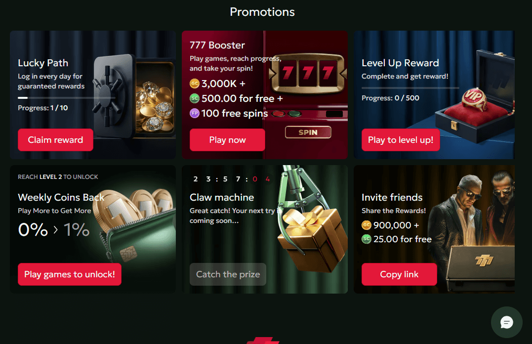 | 777 Booster | Reach gameplay milestones or unlock via level progression. | GC bundles, SC, free spins at set stakes; rare jackpot-style payouts. | Not disclosed; player reports suggest outcomes heavily favor GC over SC. |