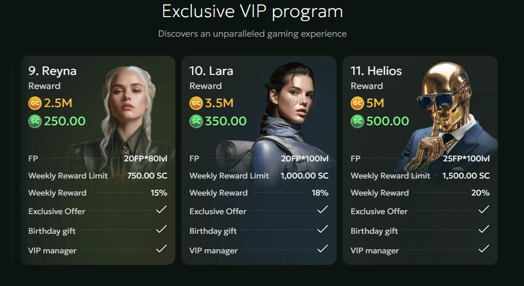 | High-tier (Lara, Helios, etc.) | Up to 5M GC + 500 SC claimed on marketing materials. | 15–20% claimed; player reports suggest this is either unavailable or heavily capped. | Up to 1,500 SC claimed; actual delivery disputed in forums. | Higher-tier players report no meaningful multiplier. | No permanent discount tier; same restrictions as other players. |