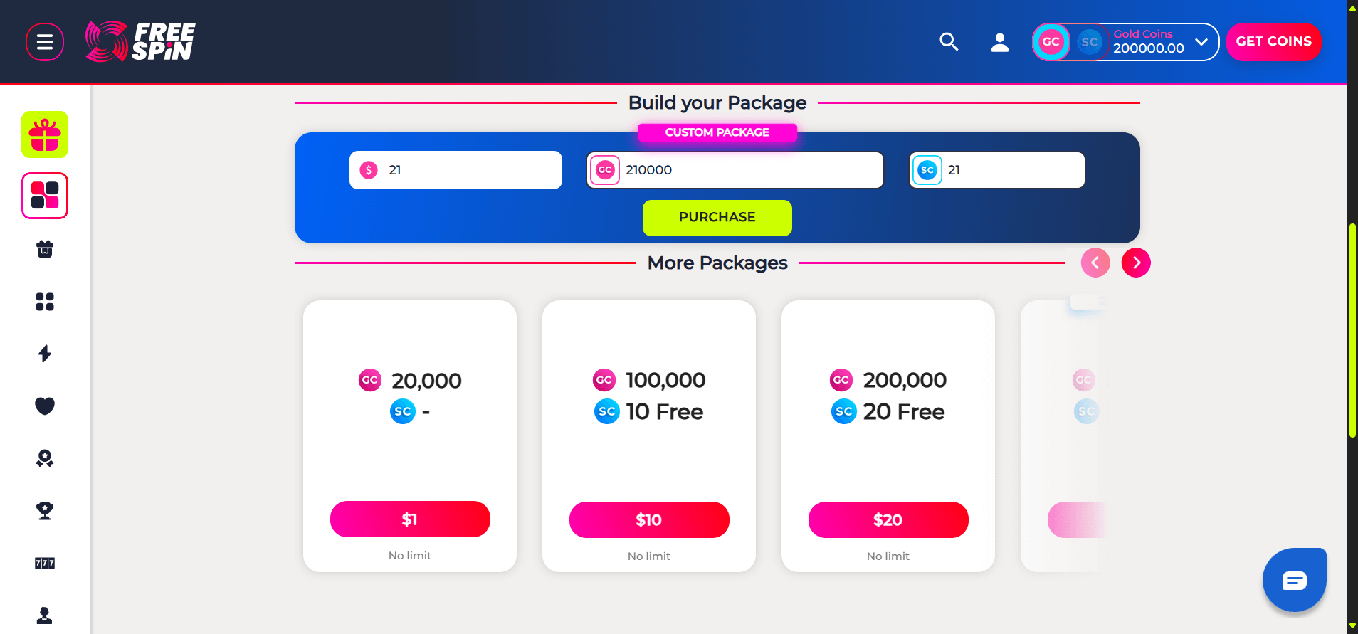 Another feature that impressed me was the custom packages. Free Spin allows you to create your own Gold Coin + Sweeps Coin bundle, customizing the deposit amount to your liking. This gave me much more freedom when it came time to deposit and meant that I wasn't stuck between two wildly different packages (i.e. 10 SC for $9.99 vs 20 SC for $19.99). In the end, I thought this was a really neat feature that gave power and choice back to the player.Â