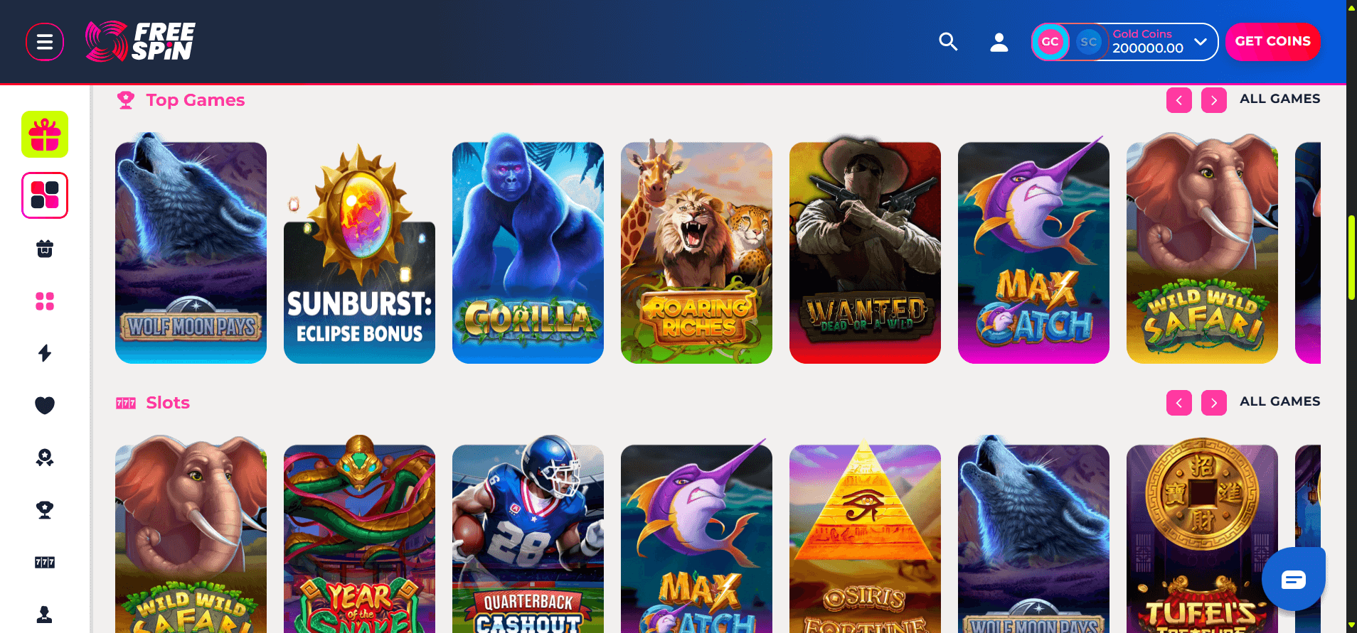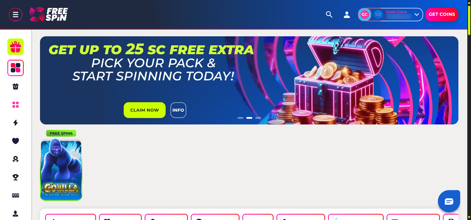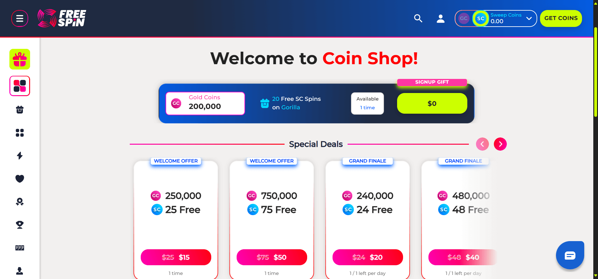When I first tried Free Spin, I was hit with a pretty refreshing range of bonus options. Most of which were no deposit spins and coin bundles. Just by registering I received 200,000 Gold Coins along with 20 free spins on the slot title "Gorilla". While the promo seemed exciting in principal when it came time to actually using those 20 free spins, I realized that they were set to the lowest possible SC betting amount. This meant that no matter what I hit I would never get crazy sums. In total, from my 20 free spins on Gorilla, I made about 0.2 Sweeps Coins, slightly dampening my excitement for the platform in the process.Â