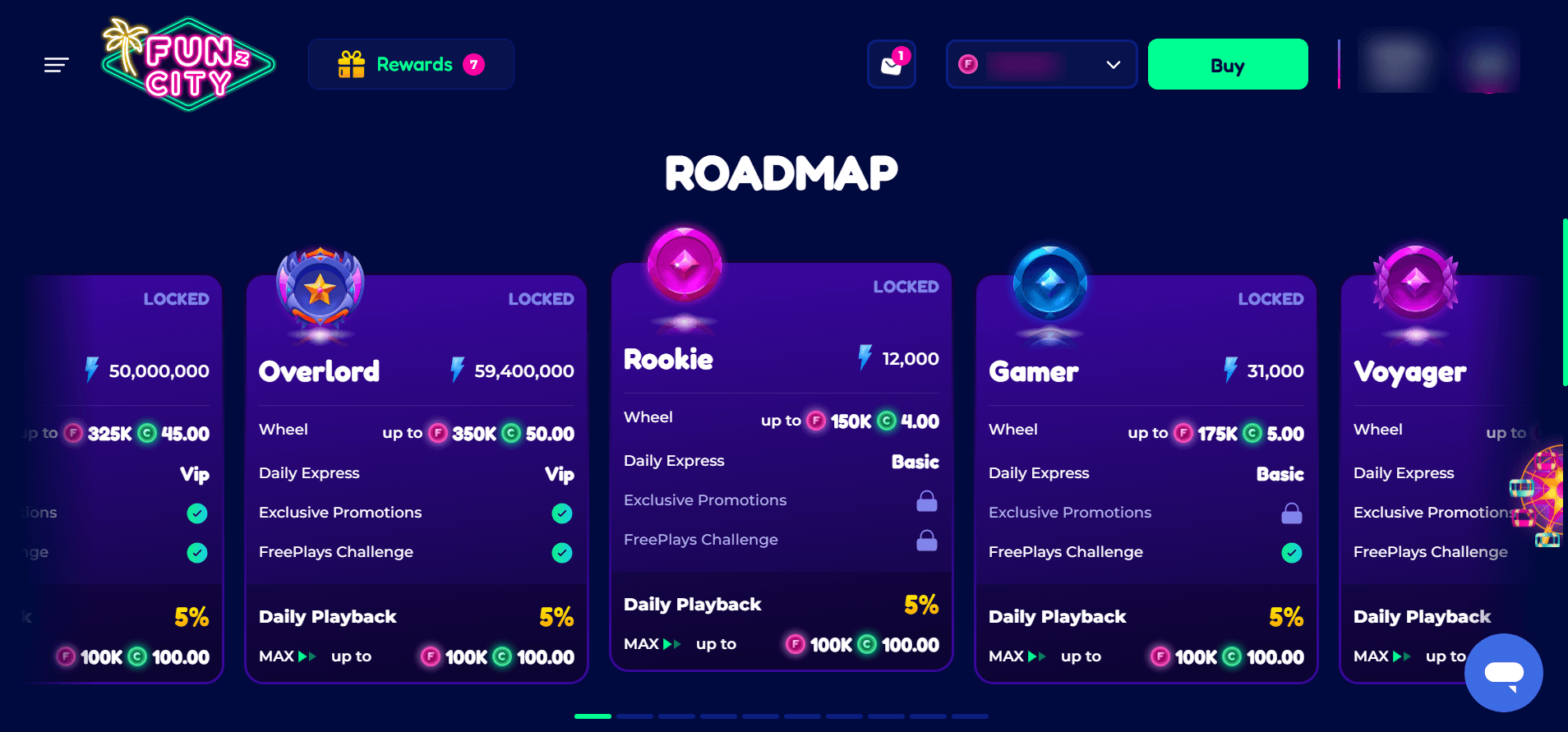 The Funz City VIP Club operates on a 10-tier system spanning from Rookie to Overlord, and this is where the platform truly differentiates itself. I earned Level Points (LP) through regular gameplay, with every wager contributing toward my progression. Starting at 12,000 LP for Rookie status, I unlocked access to the City Wheel, a prize mechanism that awards up to 350,000 FC + 50 CC at the highest tier.
