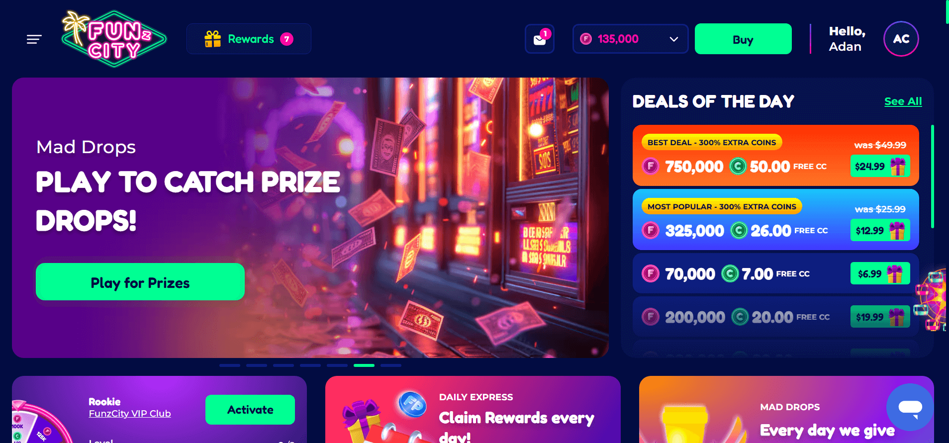 Funz City stands out in the competitive sweepstakes casino market with its vibrant neon aesthetic and genuinely rewarding VIP program that kept me engaged throughout my testing period. What makes this casino exceptional is the 10-tier VIP Club featuring the City Wheel, daily races that add competitive excitement, and a massive library exceeding 1,000 slots and fish games. The platform delivers accessible entertainment with a straightforward 125,000 Fun Coins welcome offer, while the first-purchase bonus provides substantial value at 750,000 FC + 35 City Coins for just $24.99.