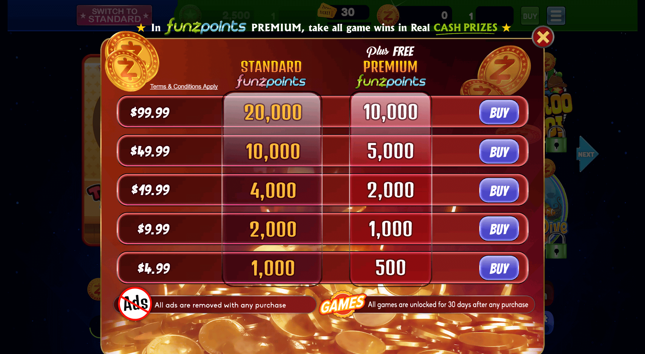 - Entertainment Currency, Standard Funzpoints, used purely for gameplay and cannot be redeemed for prizes.