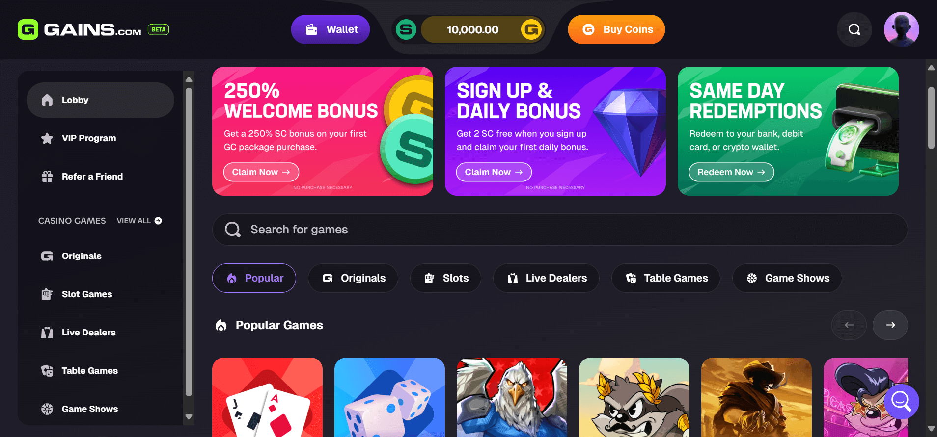 Gains launched in July 2025 with significant promiseâadvertising more than 1,000 slots, 37 live dealer games, and premium providers like NetEnt and Big Time Gaming that are rarely found at social casinos. What initially caught my eye was the generous no-deposit offer of 100,000 Gold Coins and 2 Sweeps Coins, but after playing for several weeks, I discovered some concerning elements that softened my early enthusiasm.